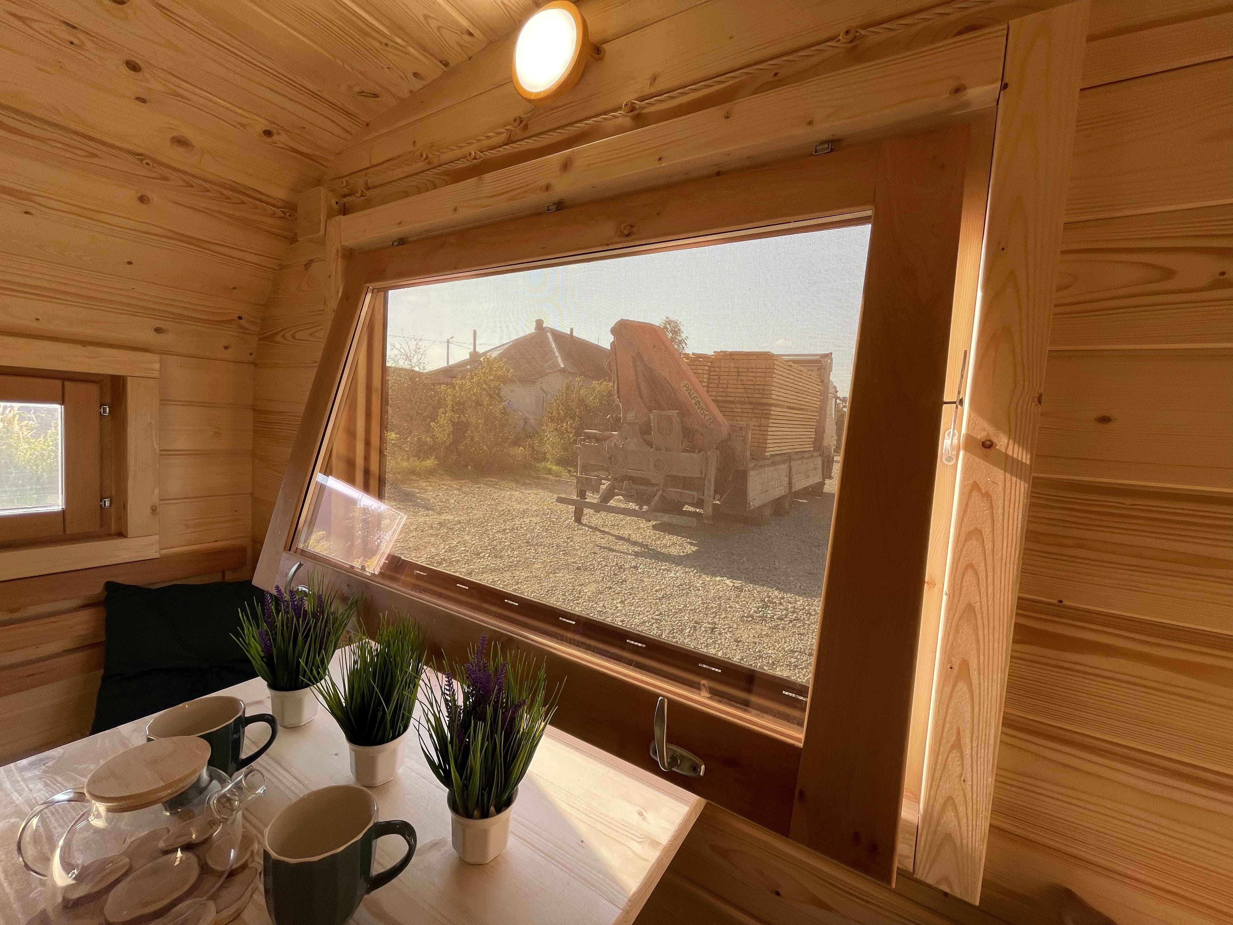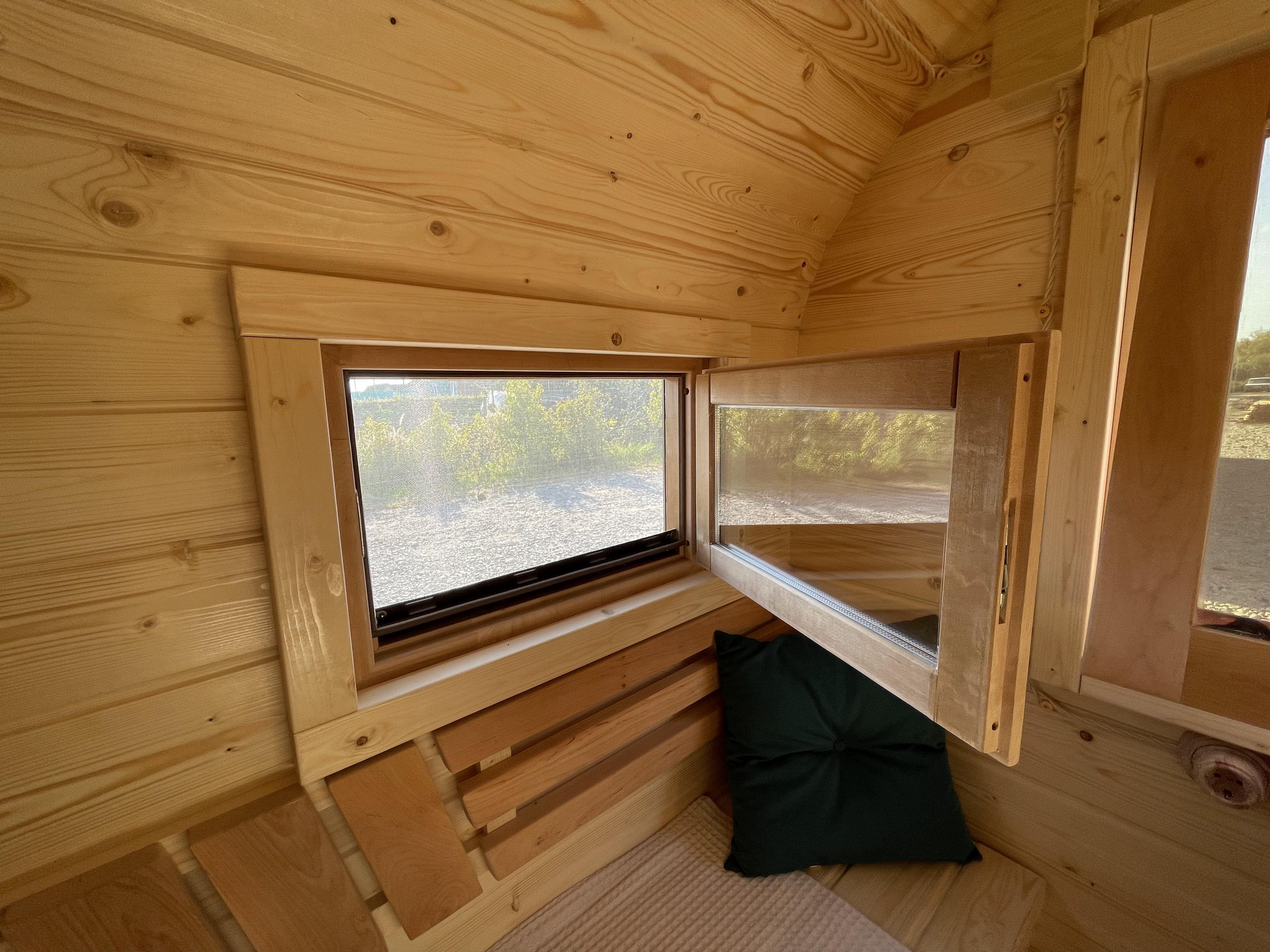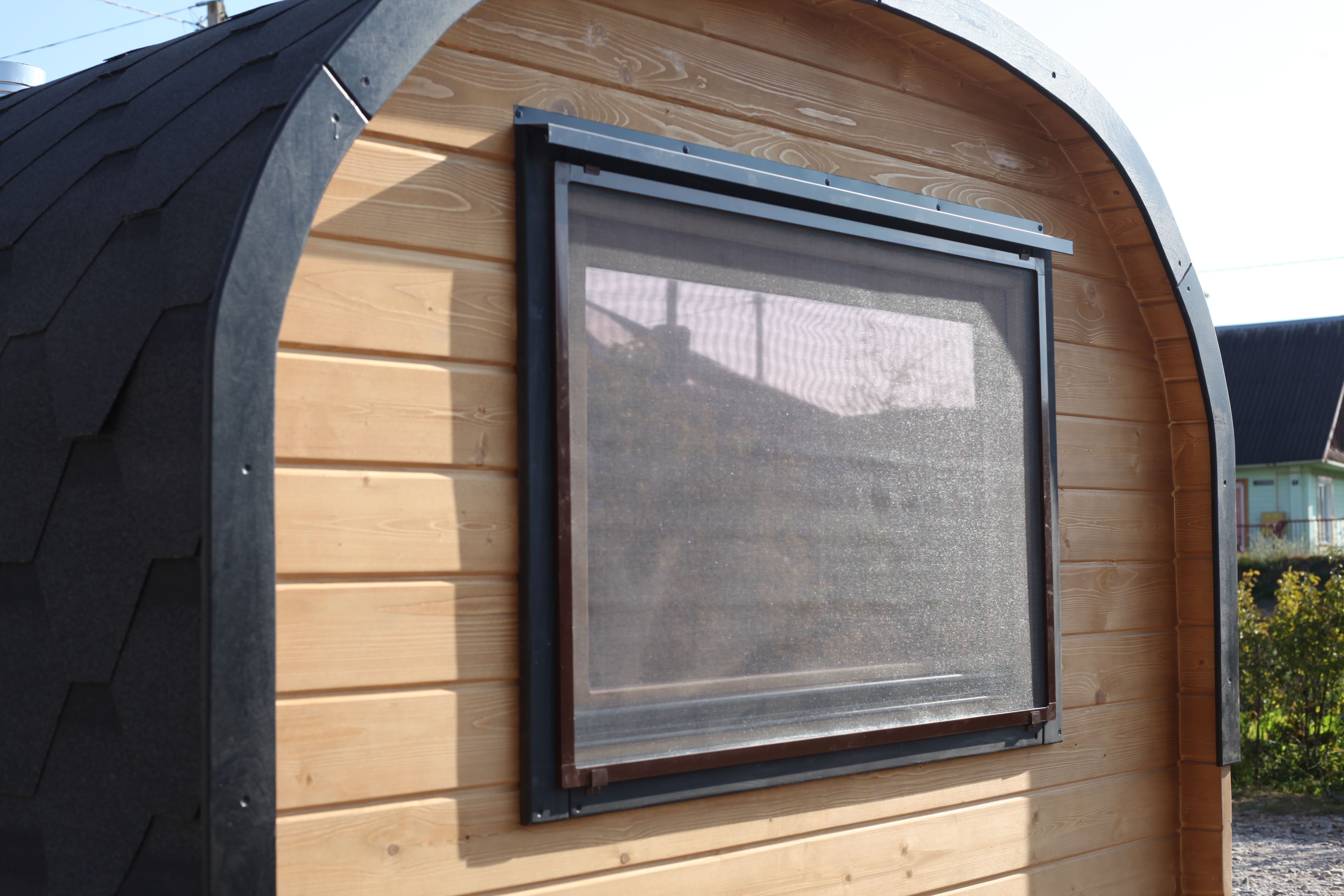 Окна из ольхи. В комнате отдыха окно 800*1200 мм. Слив сверху и снизу, наличники. М/С. Дополнительное окно 400*600 мм. Слив сверху и снизу, наличники. М/С. В парной 400*600 мм. Слив сверху и снизу, наличники. М/С. Наличники. М/С.