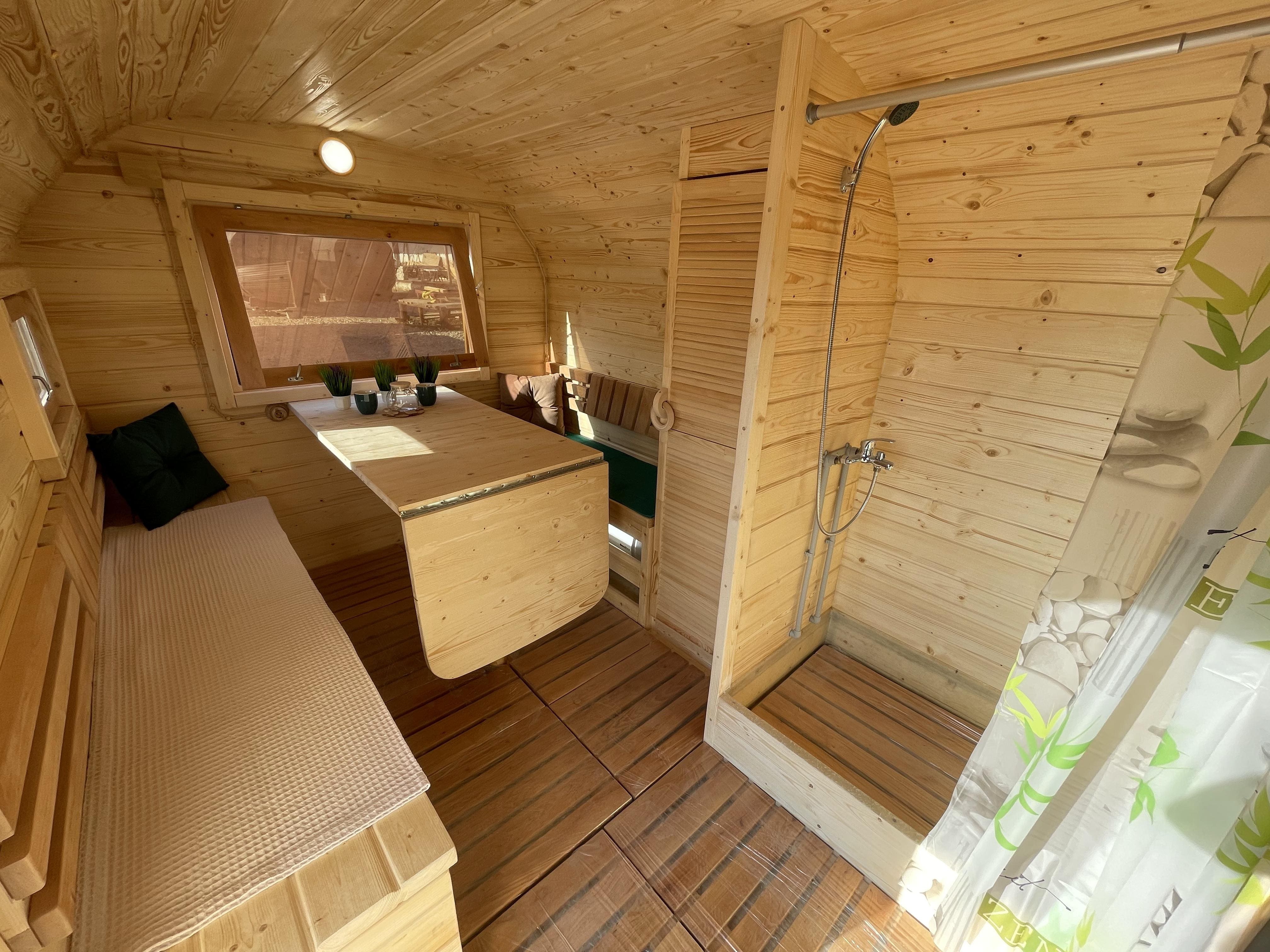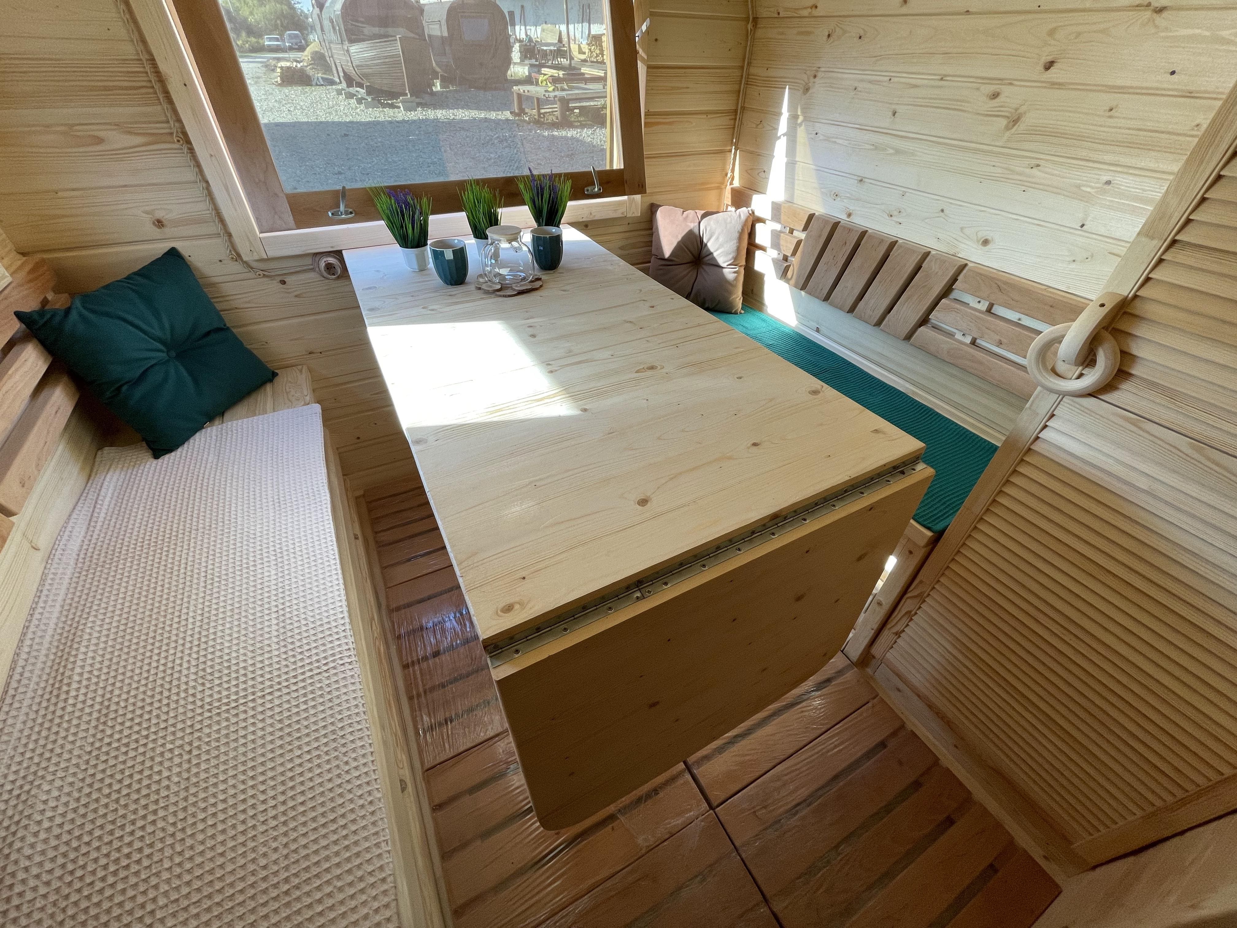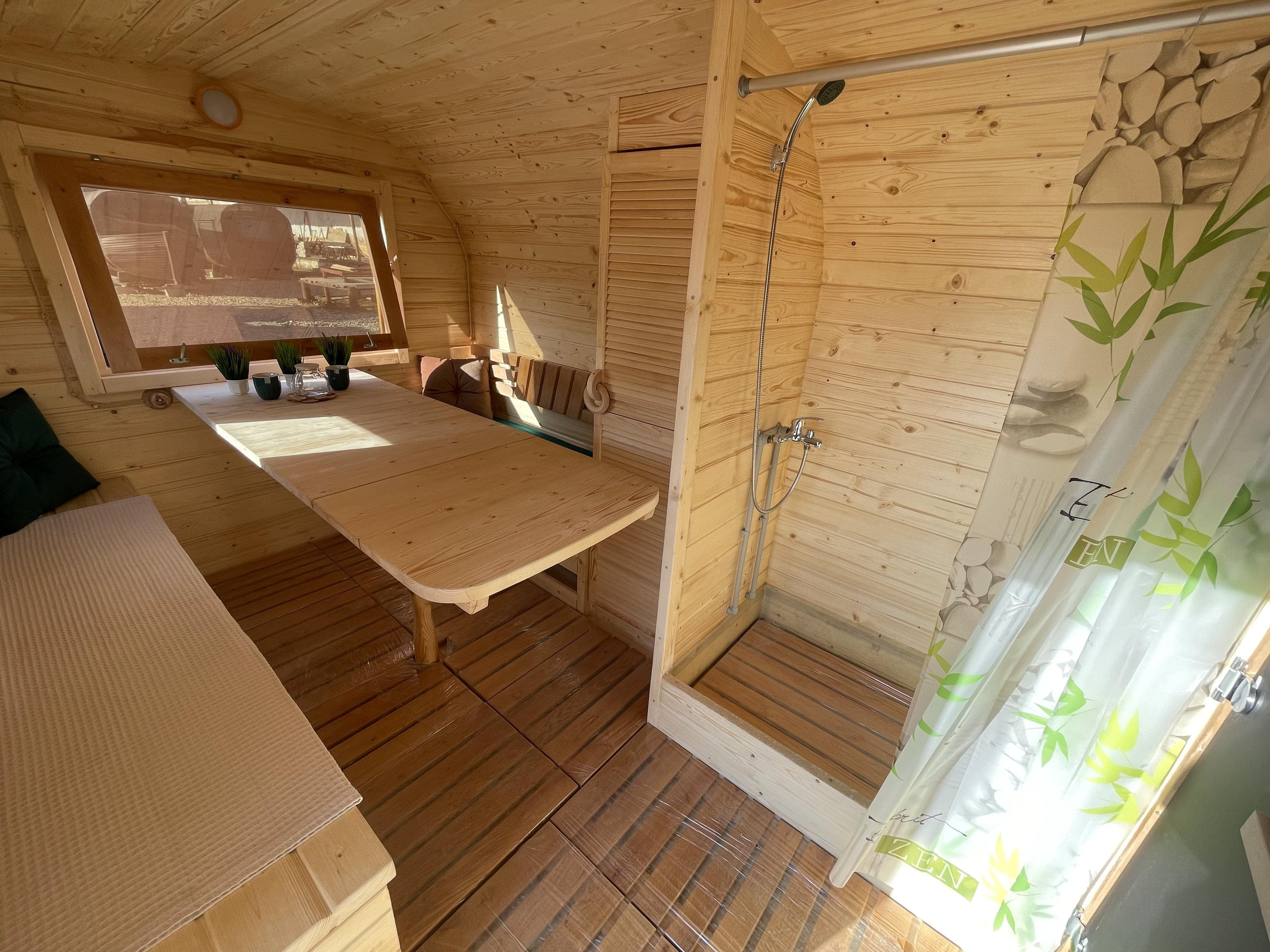 Комната отдыха: Стол длиною со скамью при входе (с откидным краем). Скамейки с подъемными крышками и ящиками для хранения. Две спинки. Шкаф с одной жалюзийной дверцей, р-р 600*1810*400 мм. Душевой уголок с поддоном из стеклопластика и шторкой (1100 мм). Смеситель и лейка. Бойлер на 50 л. (горизонтальный). Ввод воды под быстросъем (краник, трубы, быстросъем)