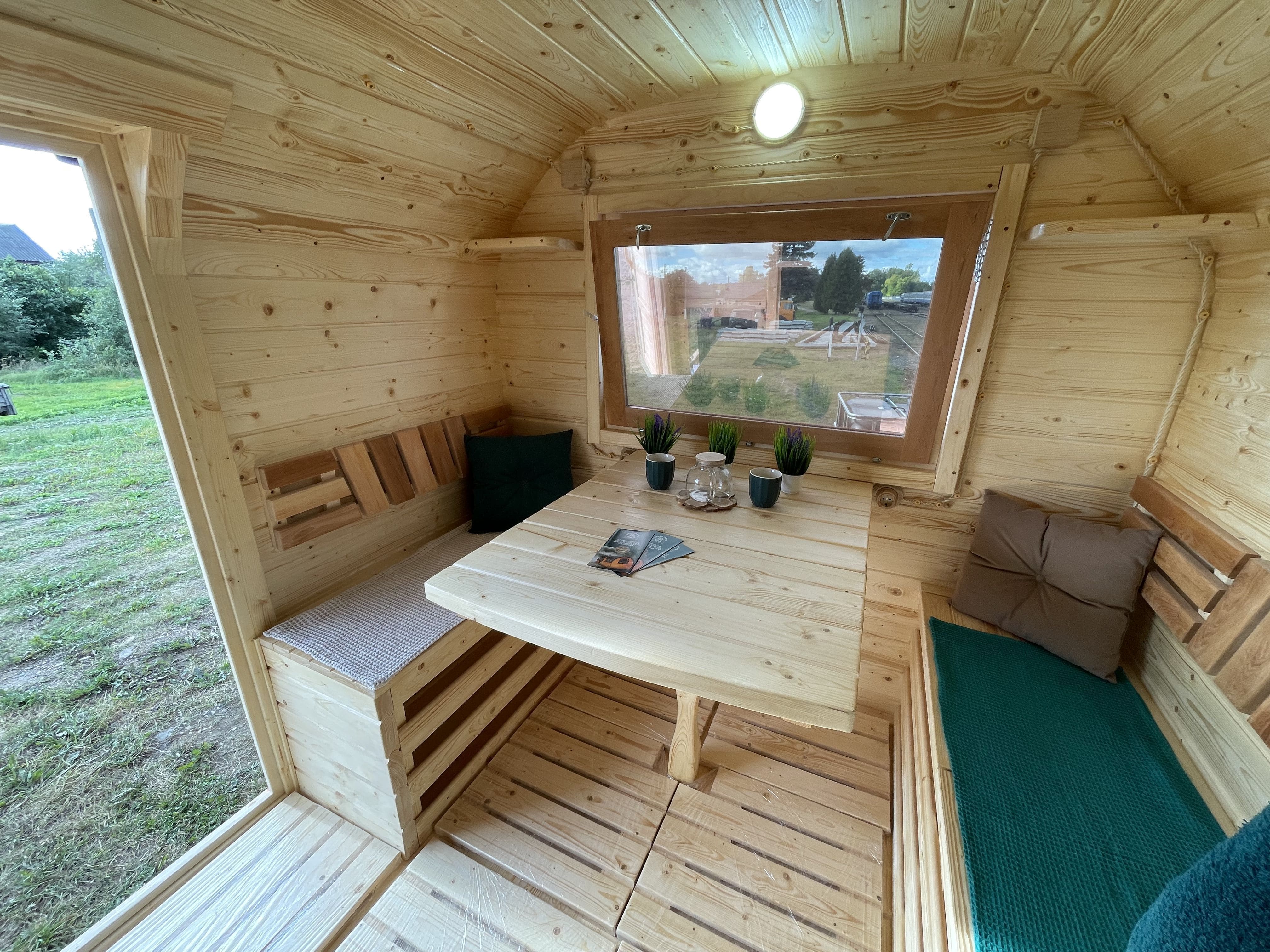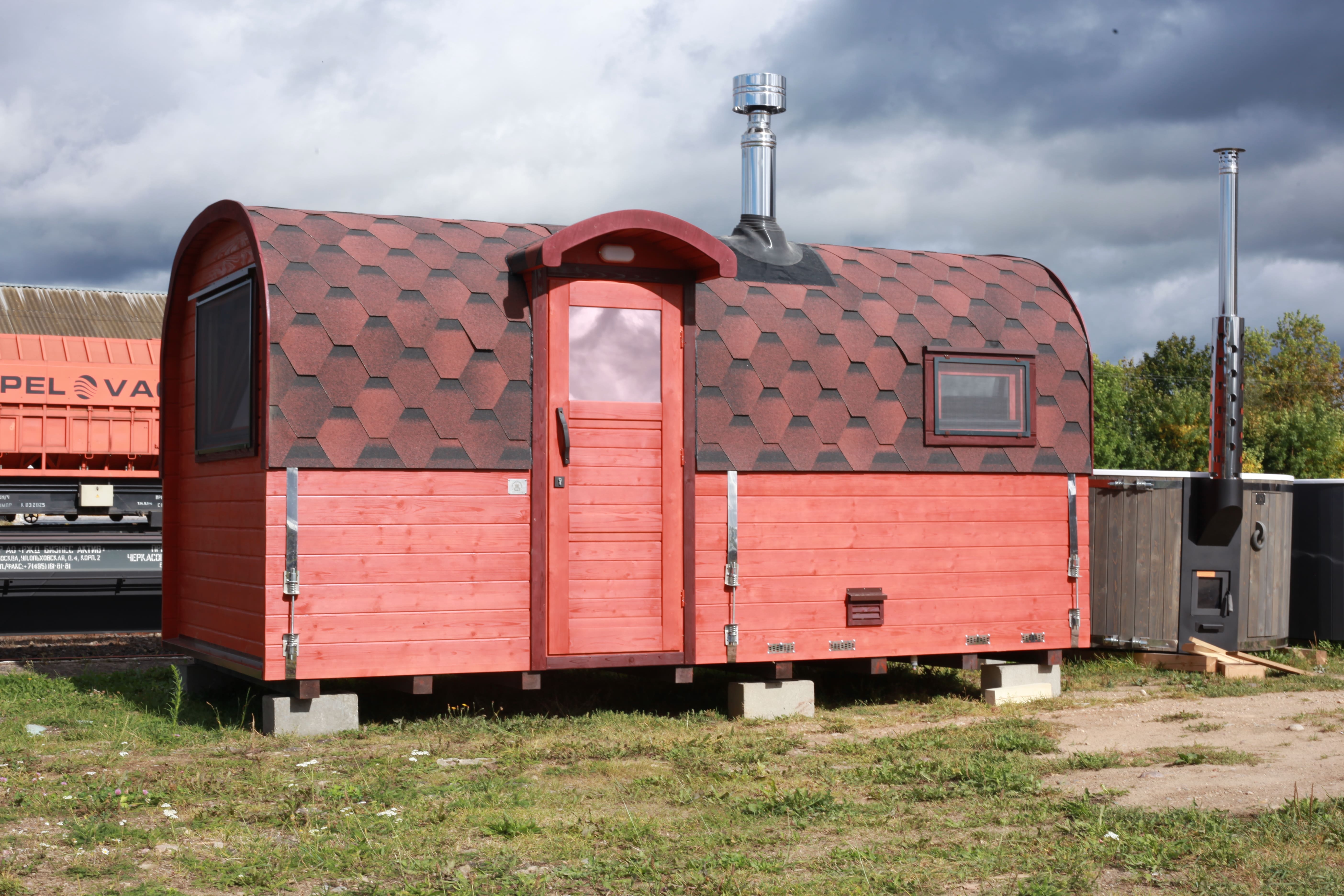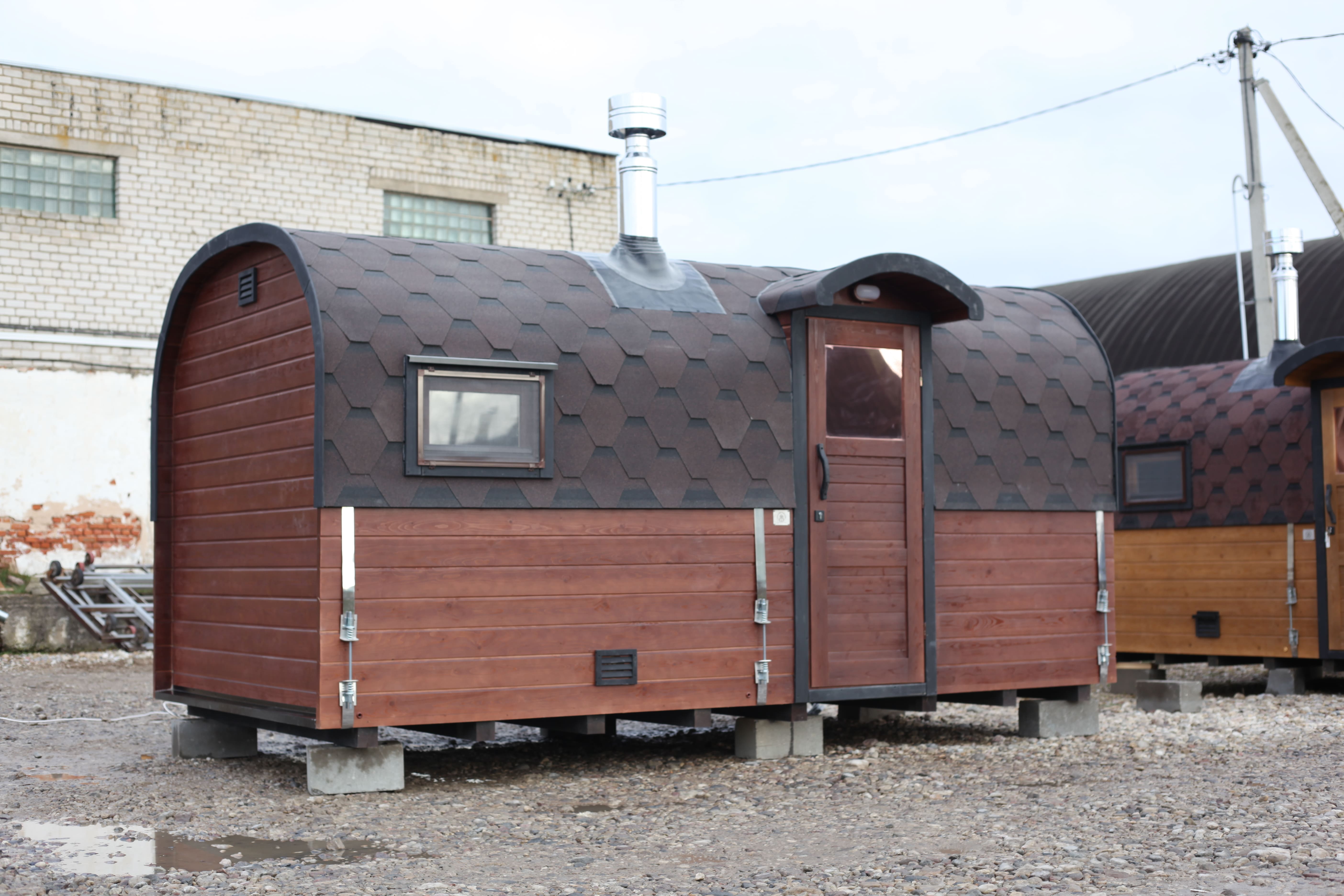 Внутри можно организовать спальное место, что позволяет использовать баню как летний домик для отдыха или ночёвки. Такой формат подходит для дачных участков и гостевого размещения.