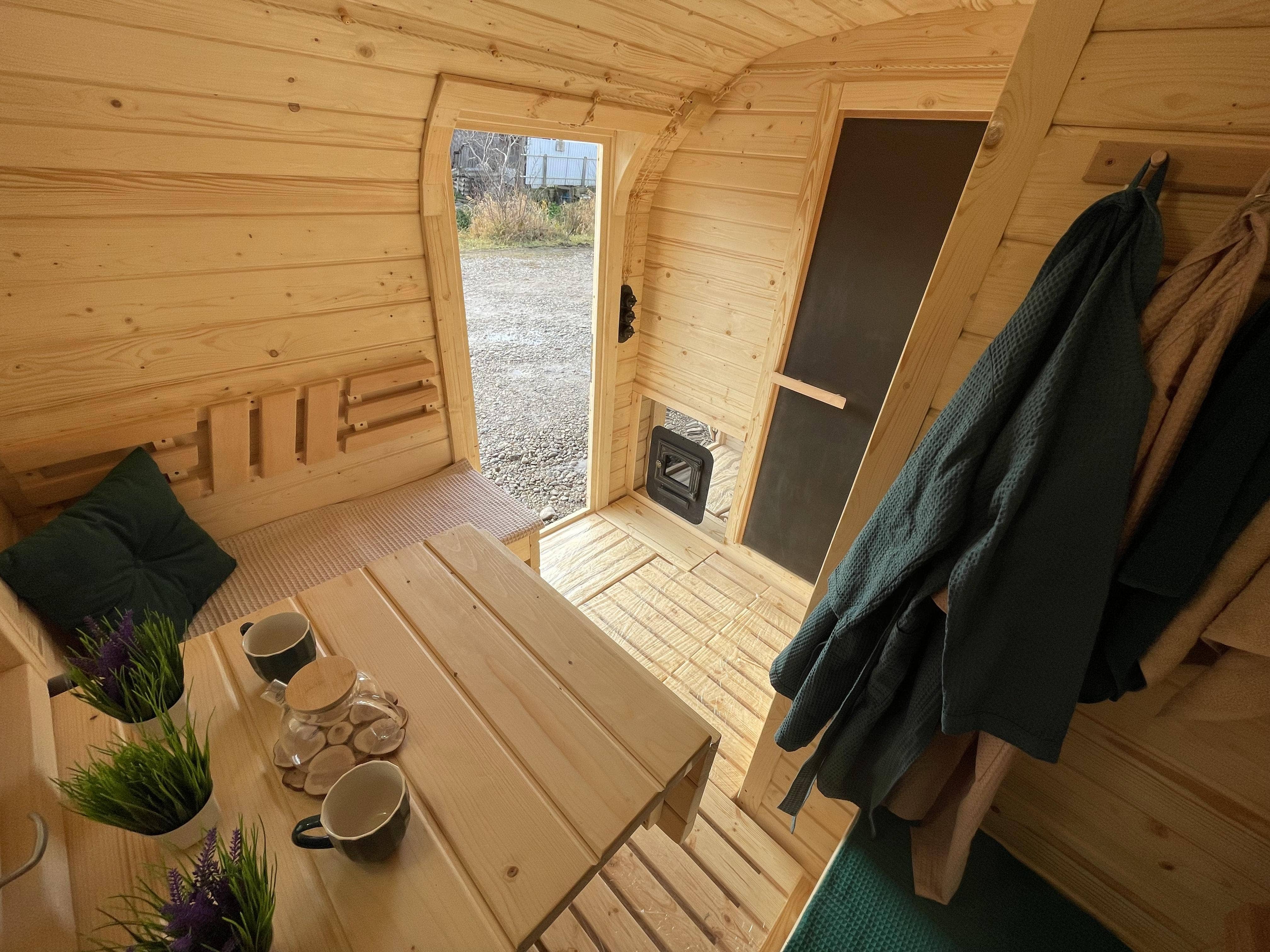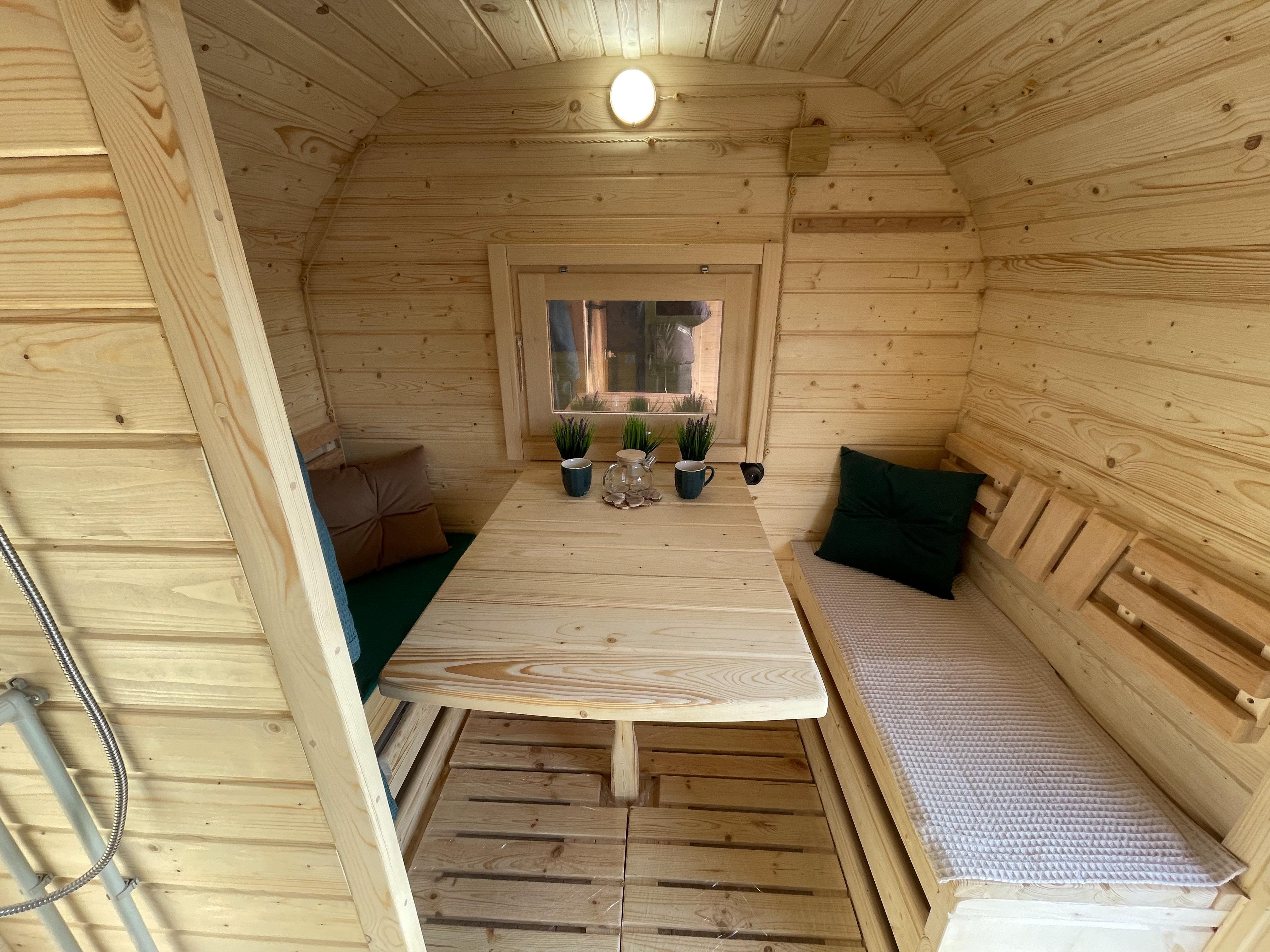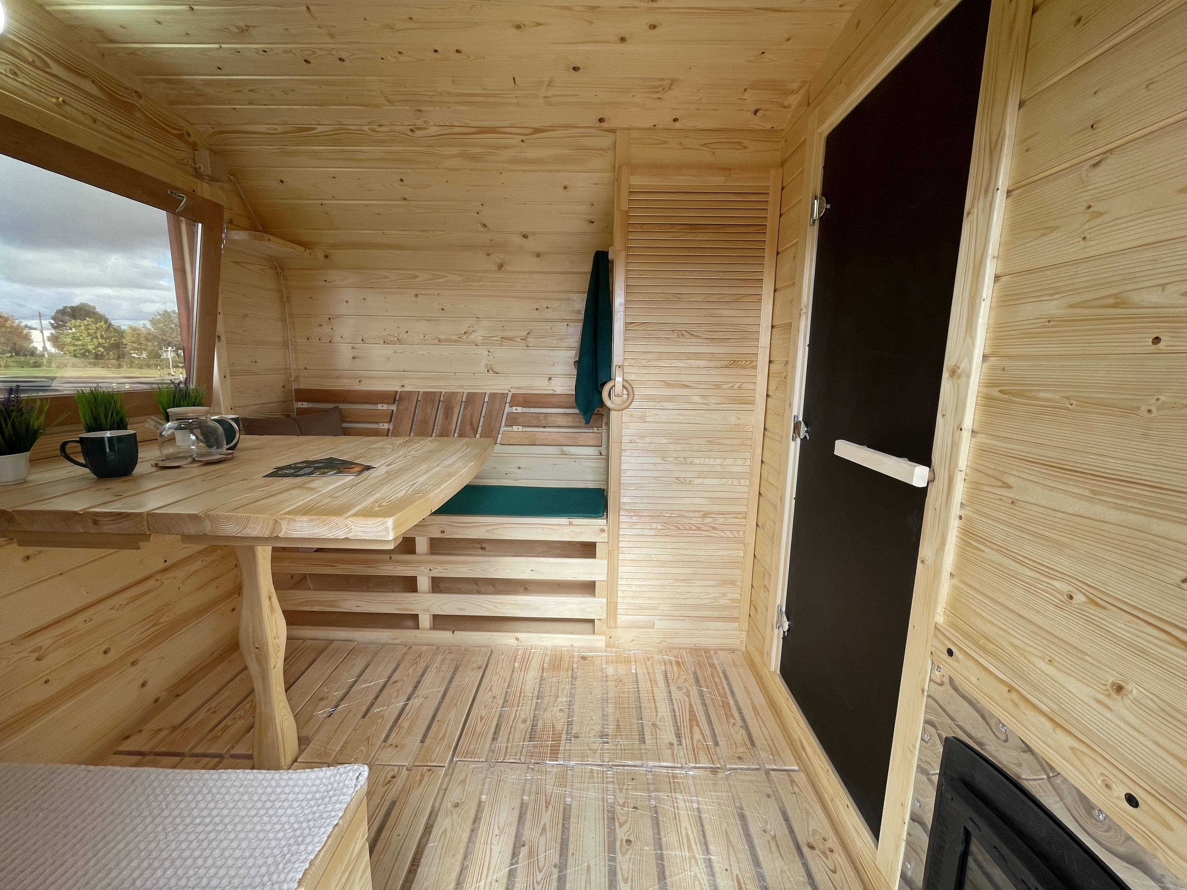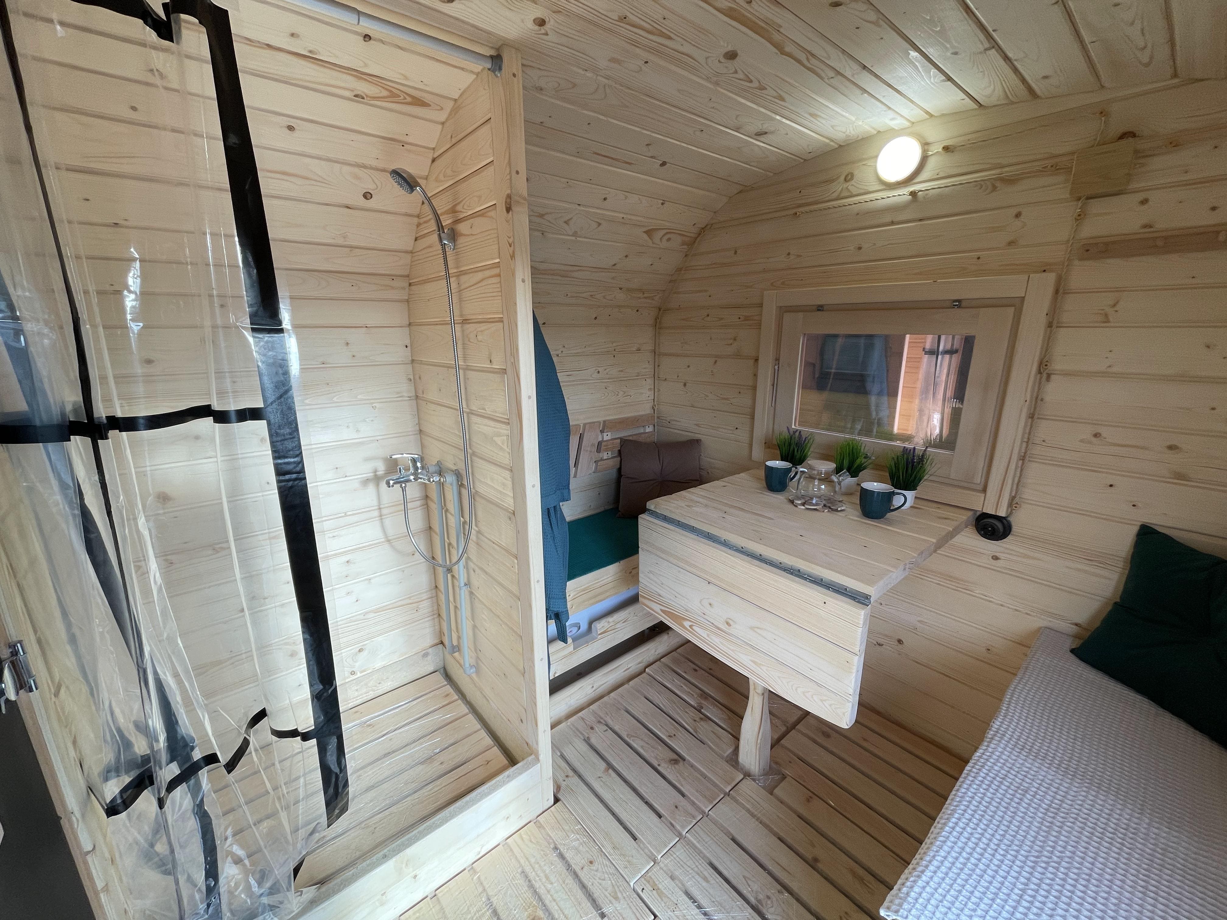 Внутри можно организовать спальное место, что позволяет использовать баню как летний домик для отдыха или ночёвки. Такой формат подходит для дачных участков и гостевого размещения.