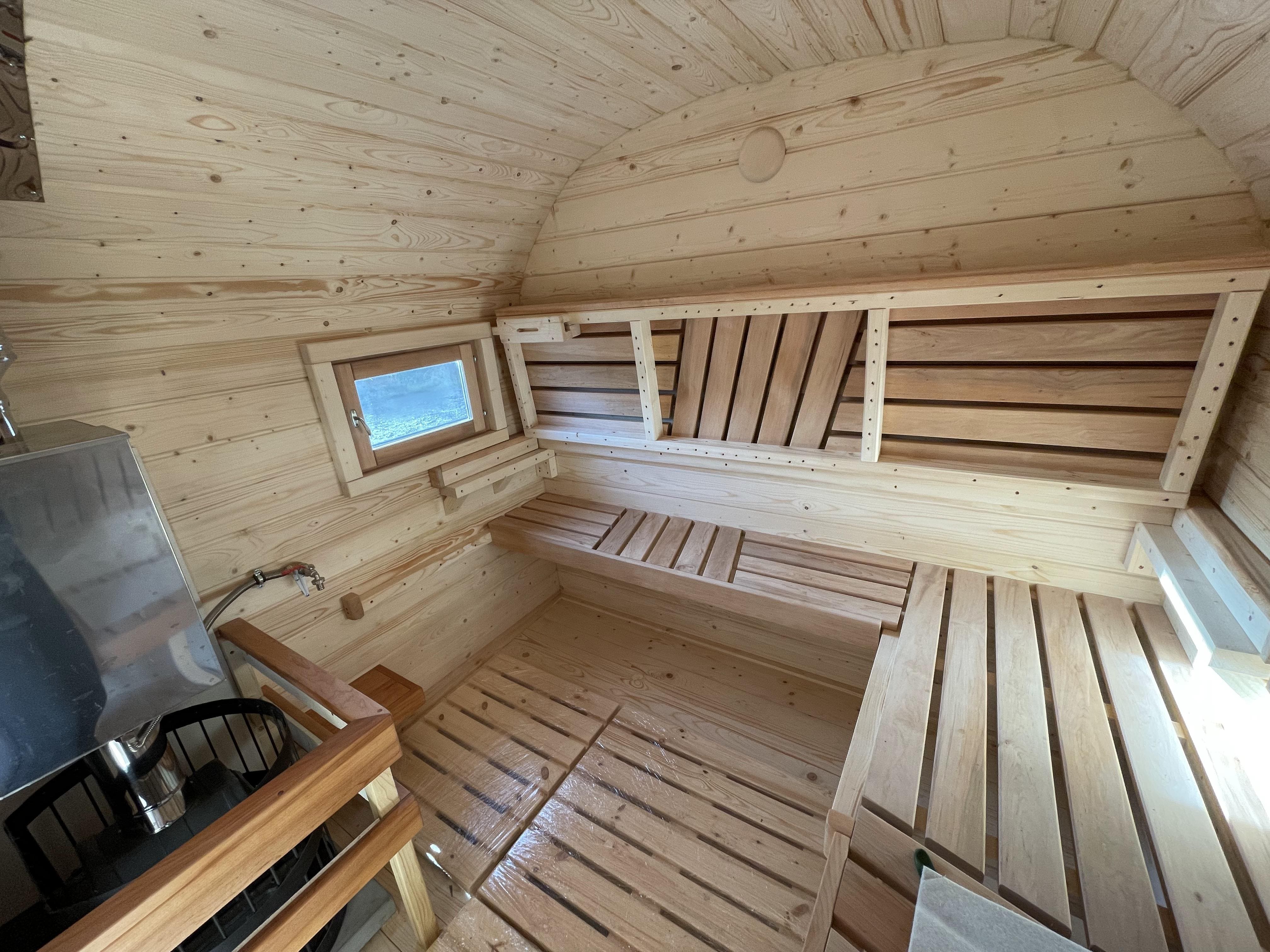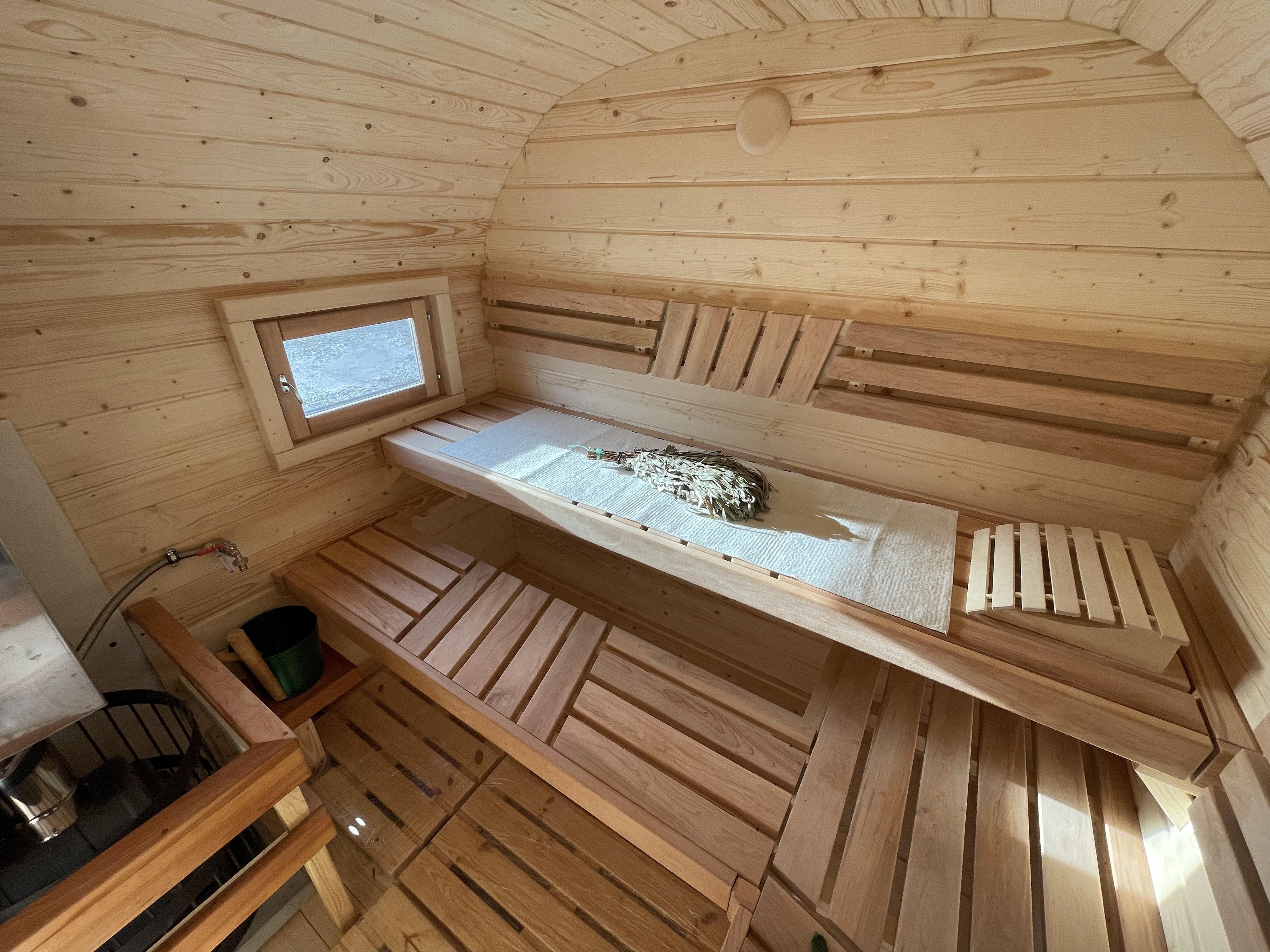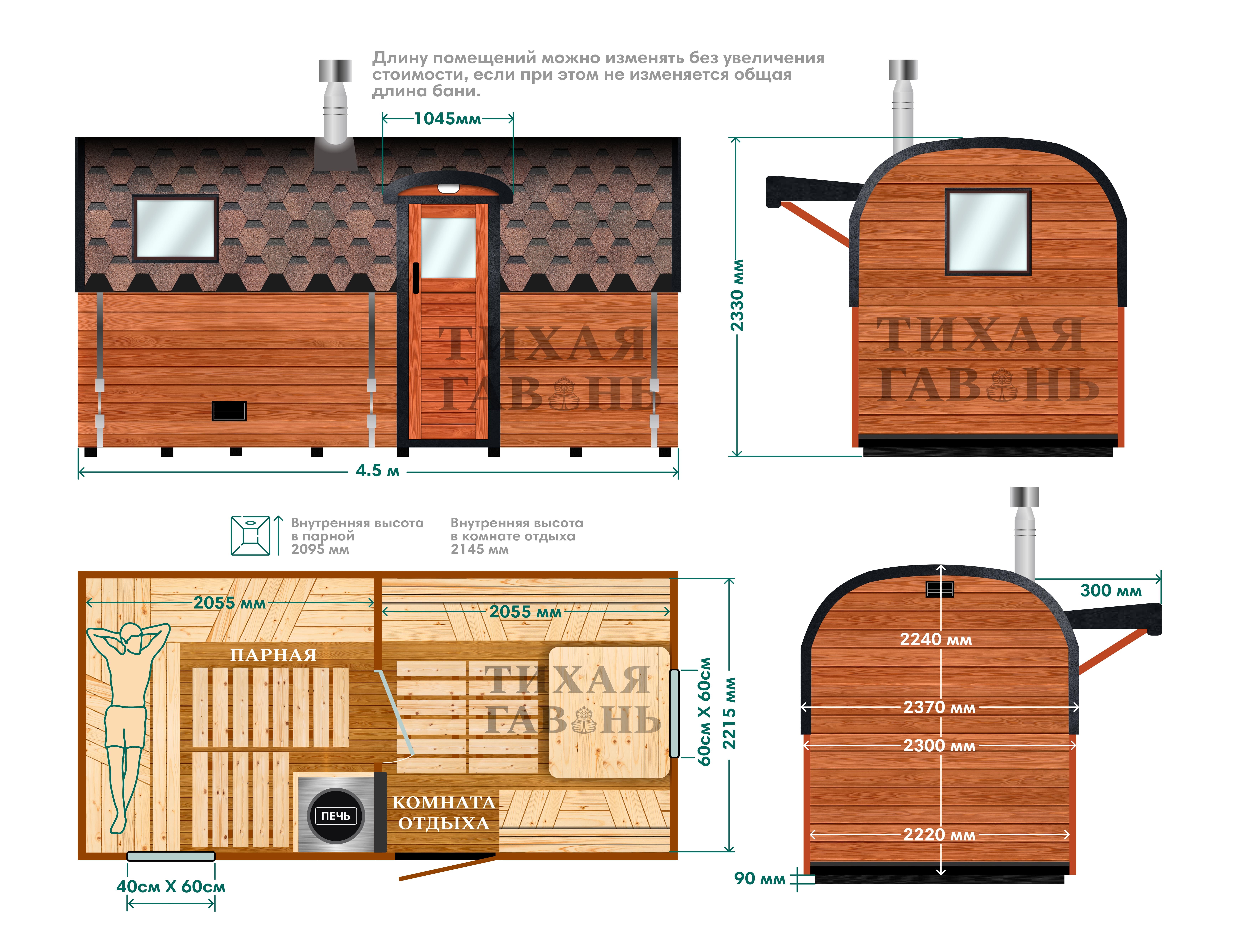 Стандартная ширина модели составляет 2,37 м, высота – 2,24 м. Для высоких людей доступно изготовление с увеличенной высотой, что делает нахождение в парной и комнате отдыха комфортнее.