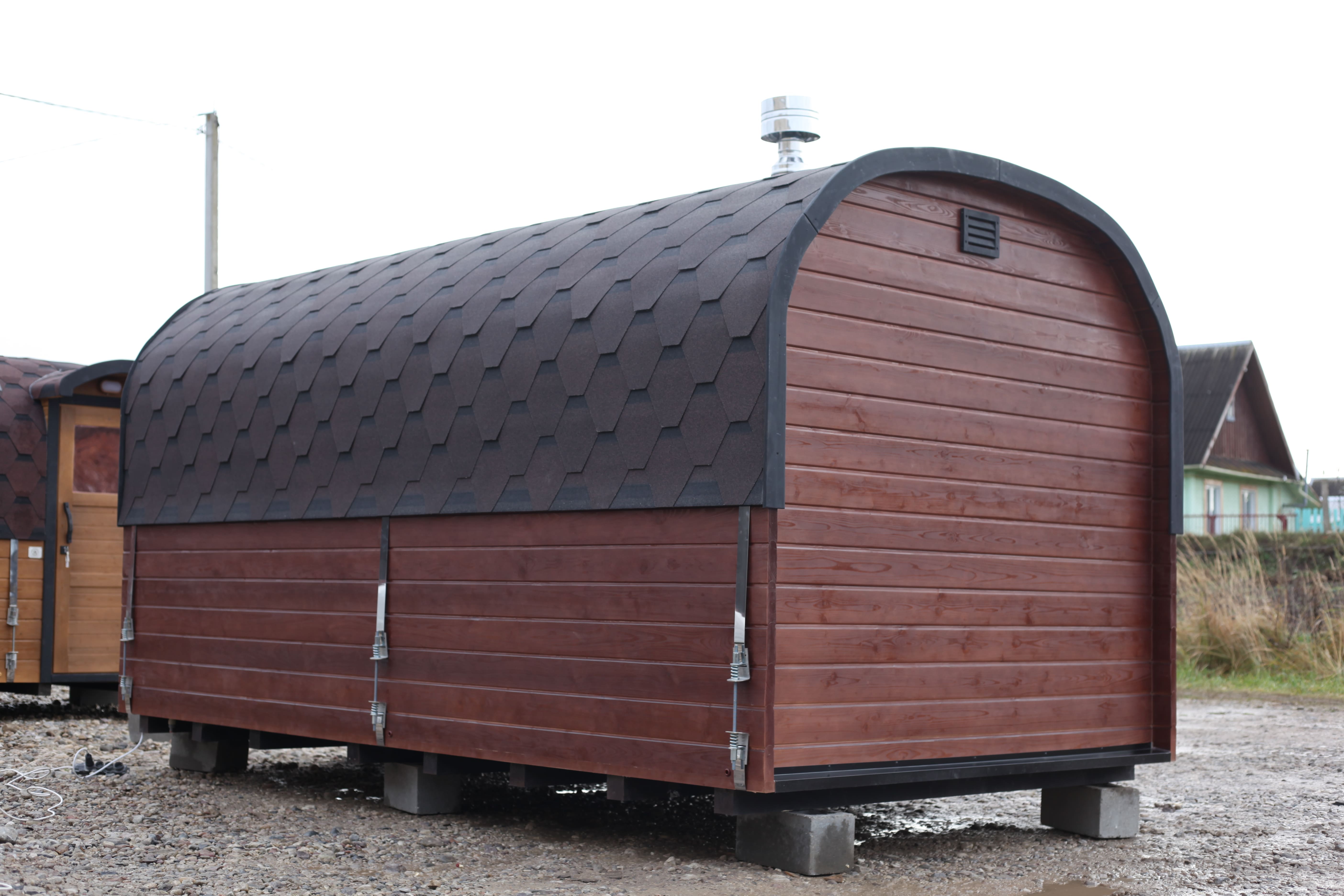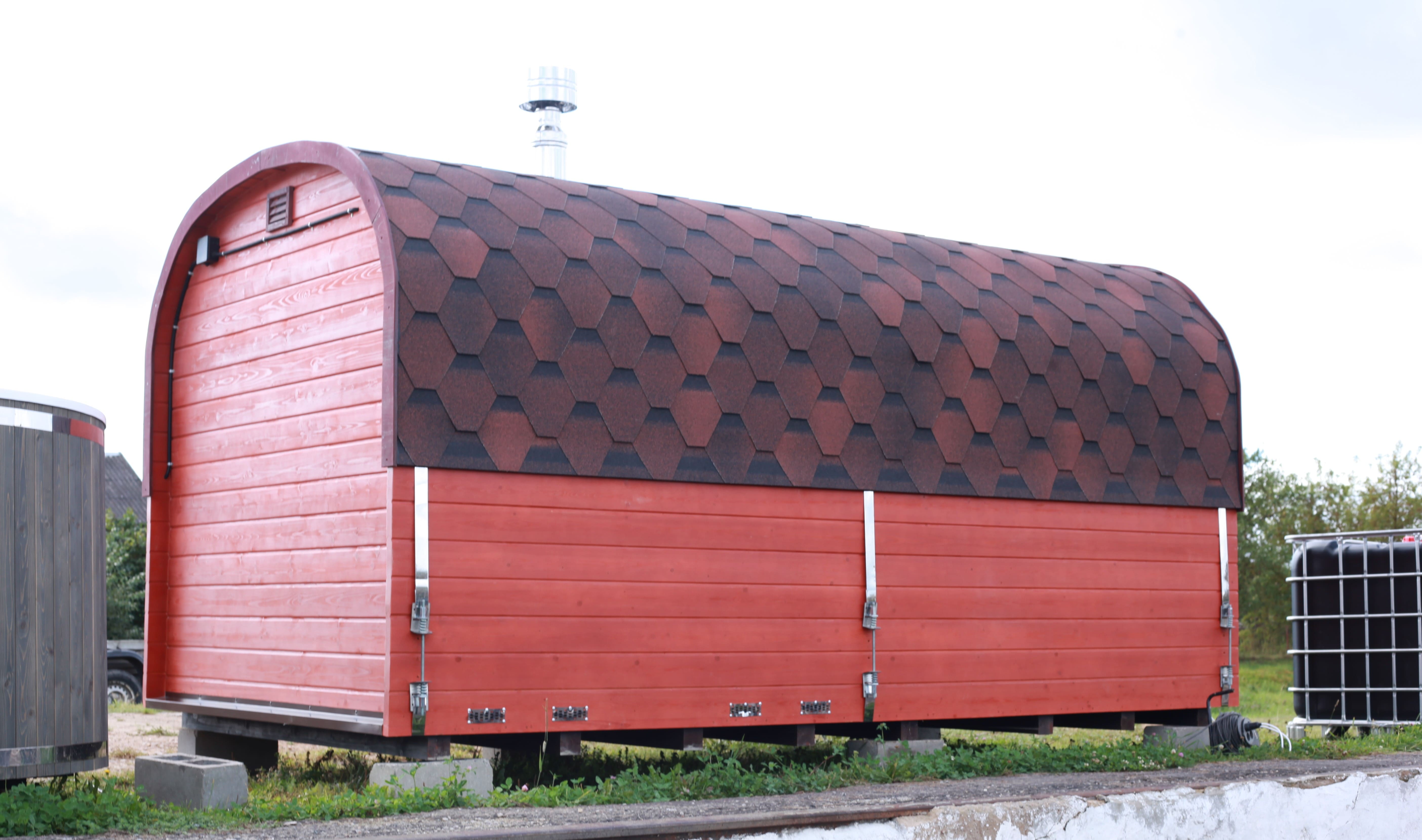 Баня выполнена в фирменной форме Квадрохаус, где корпус плавно закругляется кверху, а нижняя часть остаётся с ровным полом. Такое решение улучшает восприятие пространства внутри и сохраняет устойчивость конструкции.