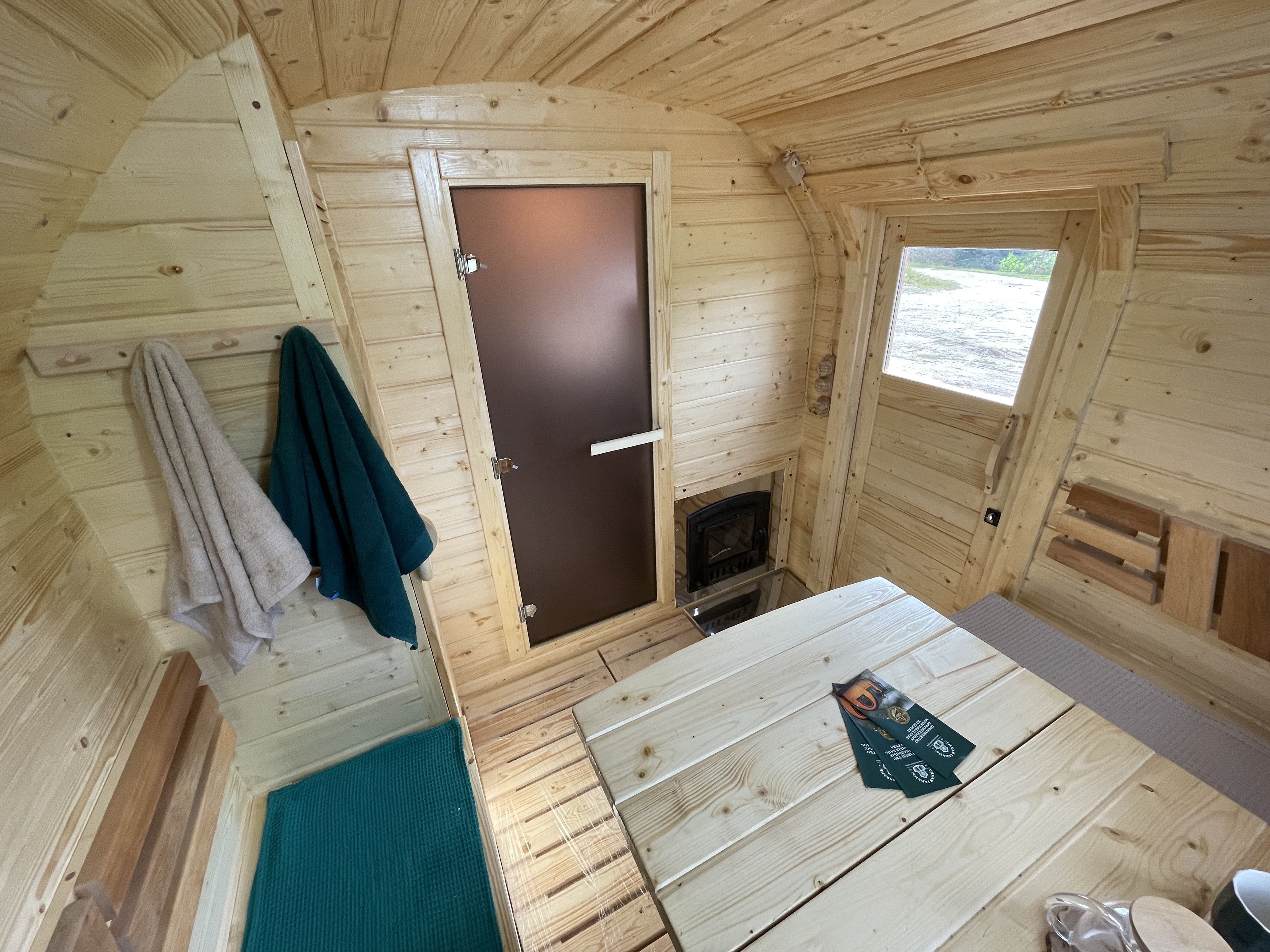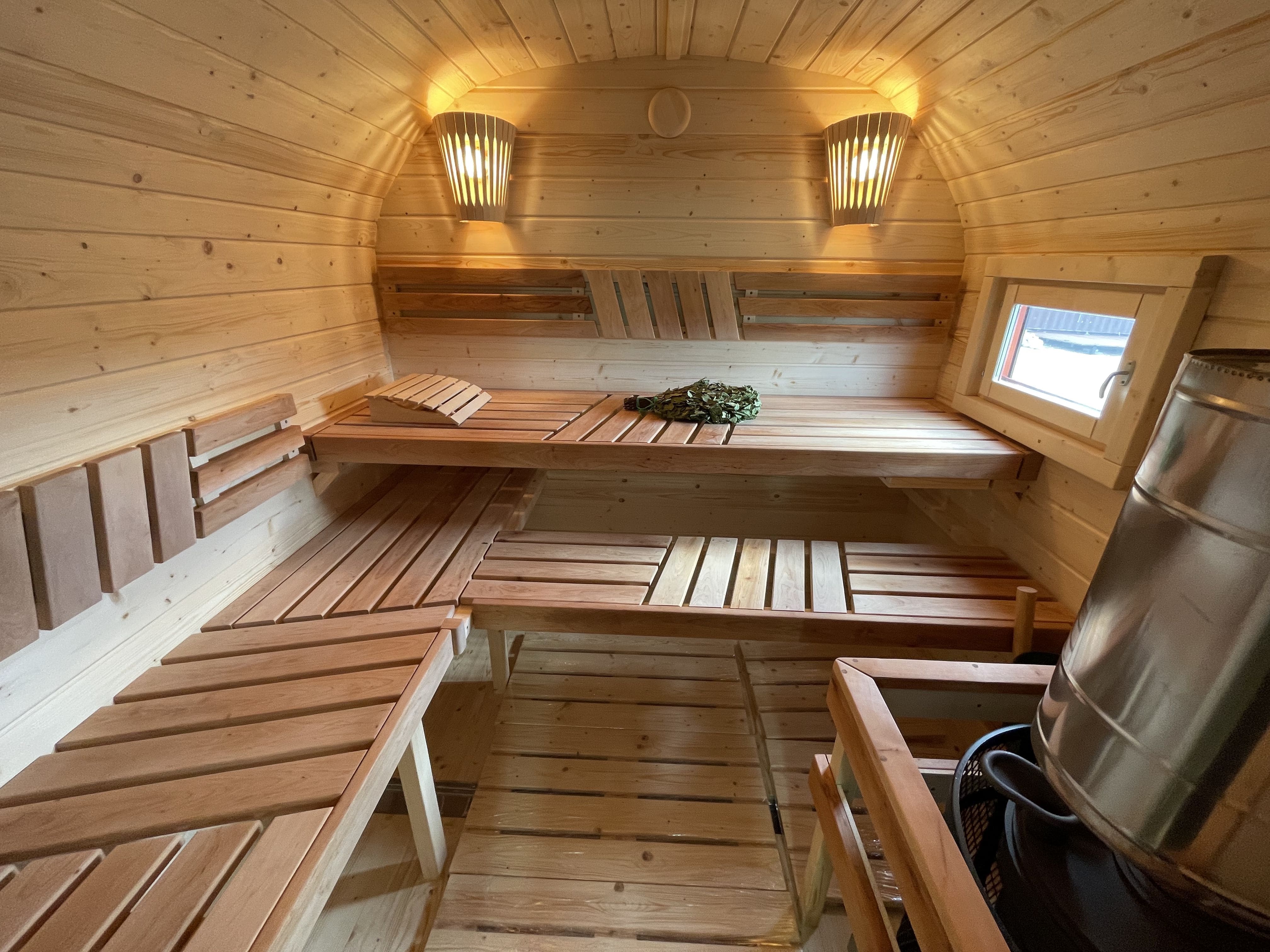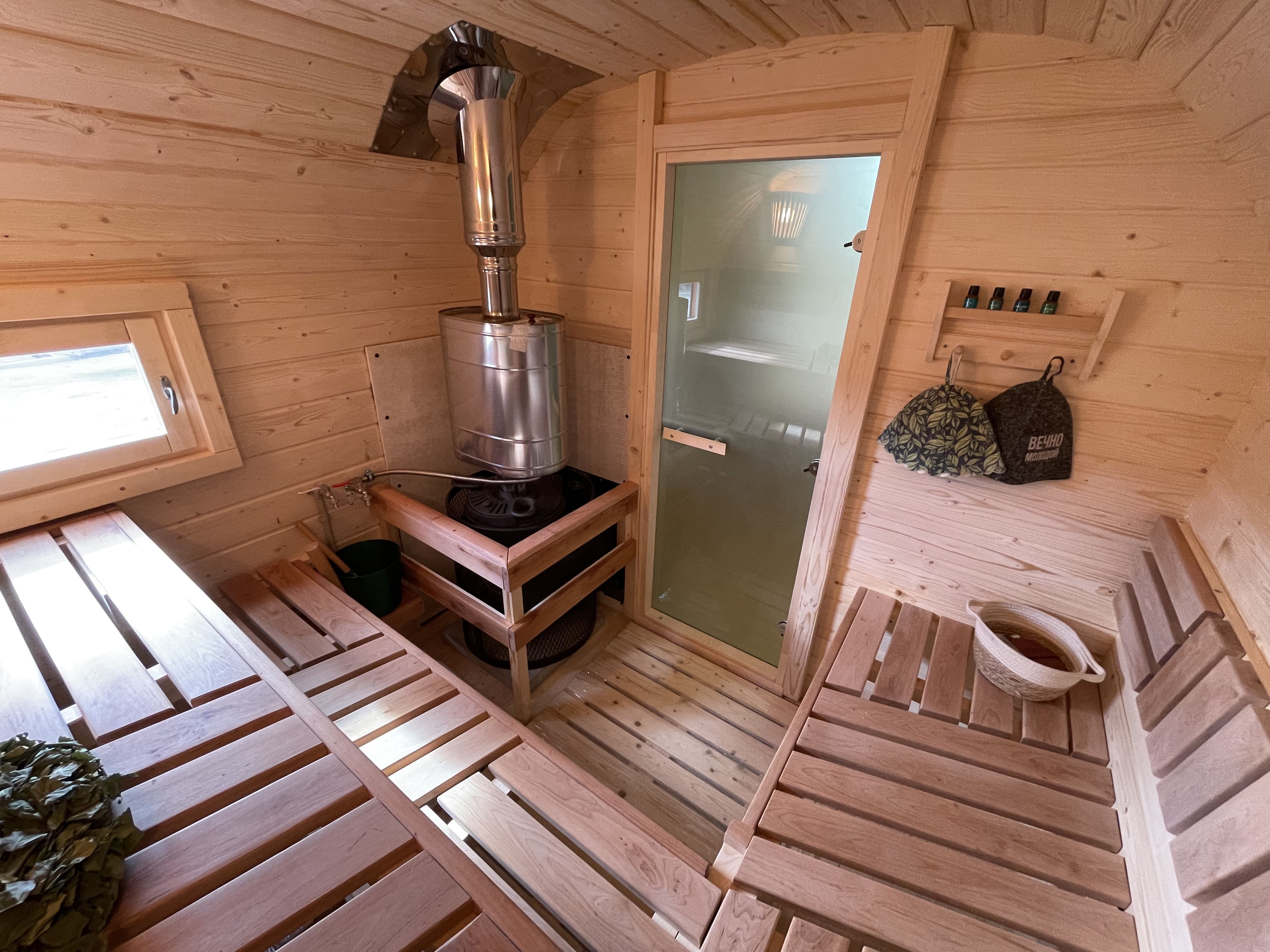 Баня прогревается до рабочей температуры примерно за 1 час. Печь подбирается под конфигурацию и формат эксплуатации, доступны дровяные и электрические варианты.