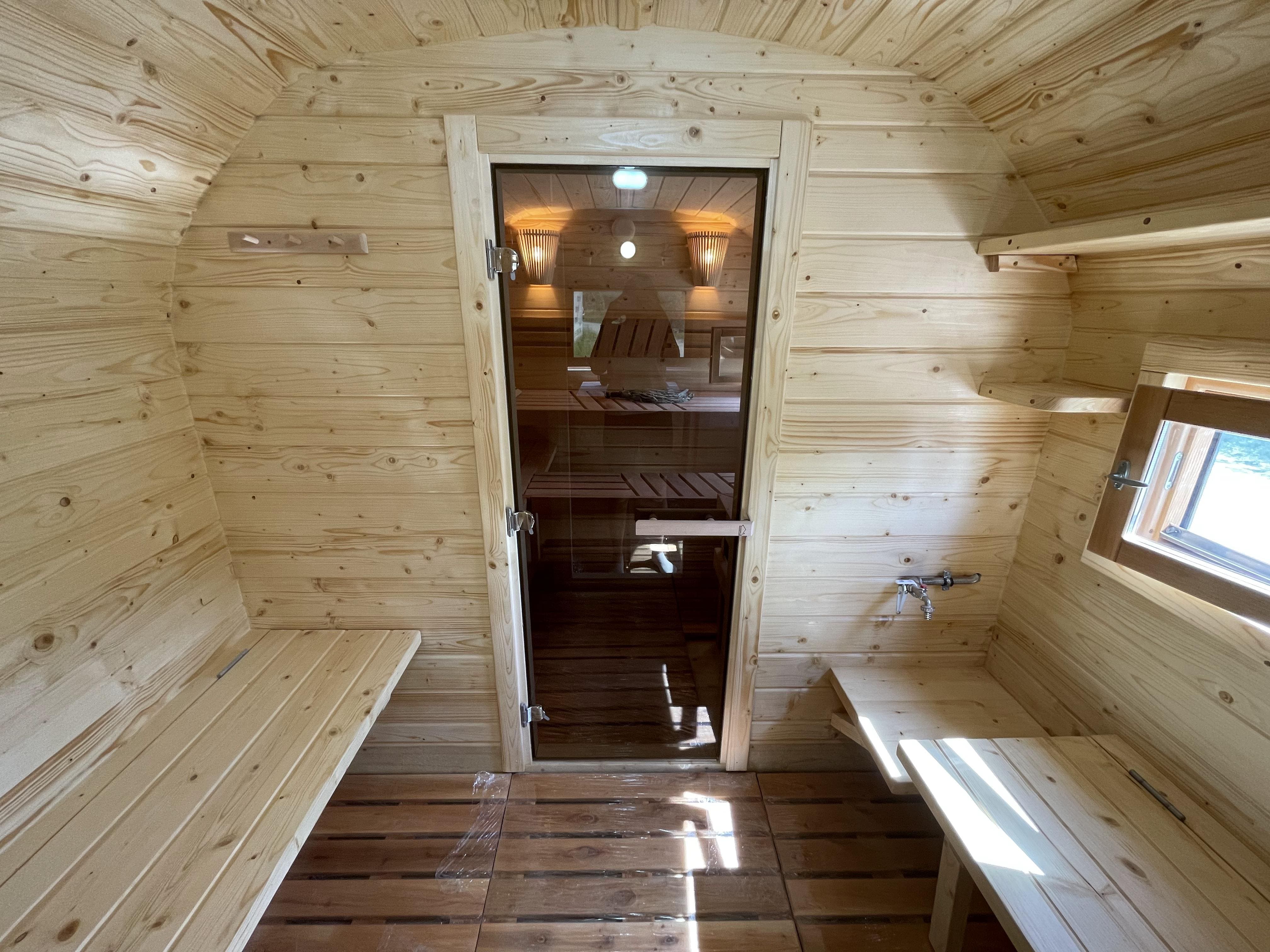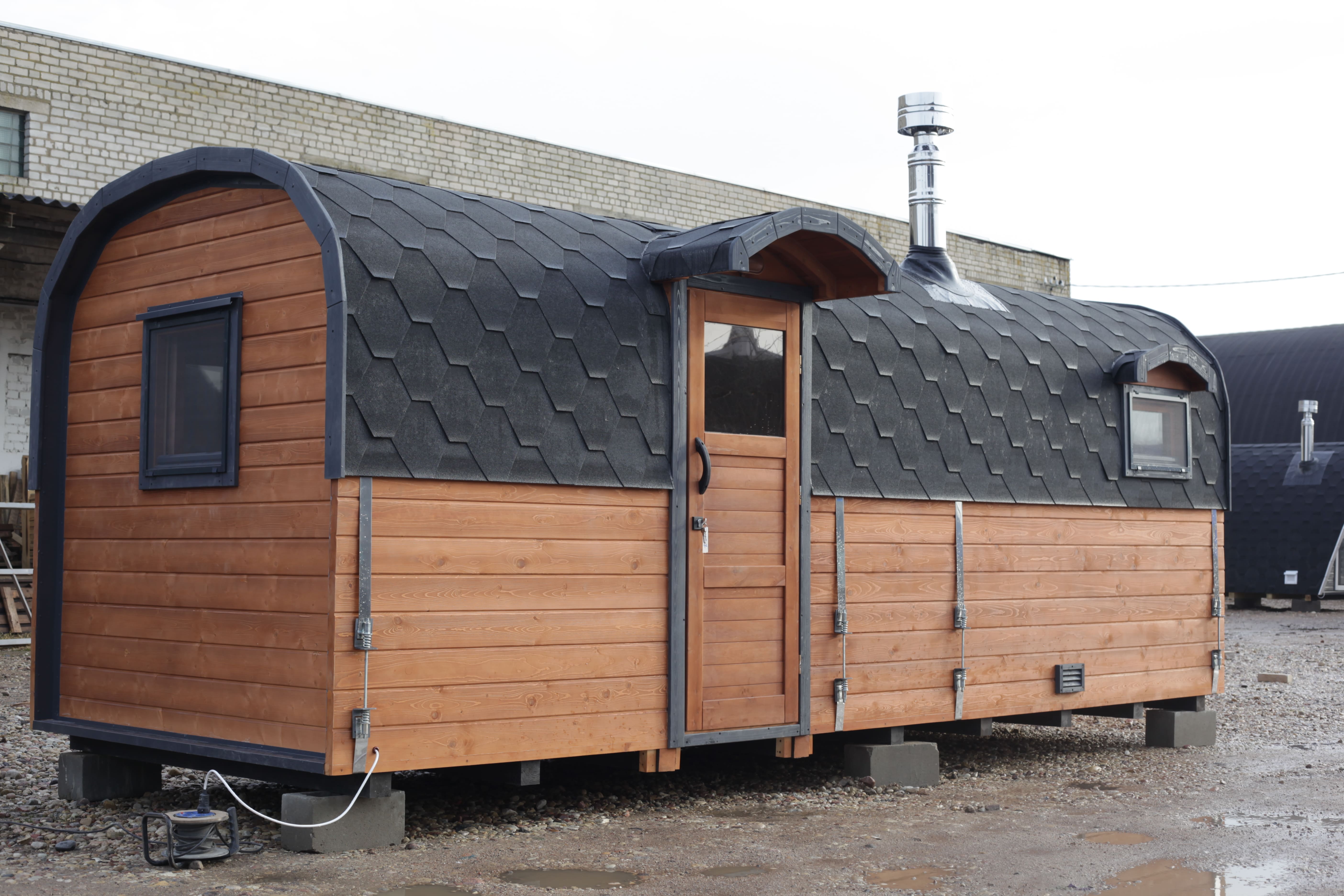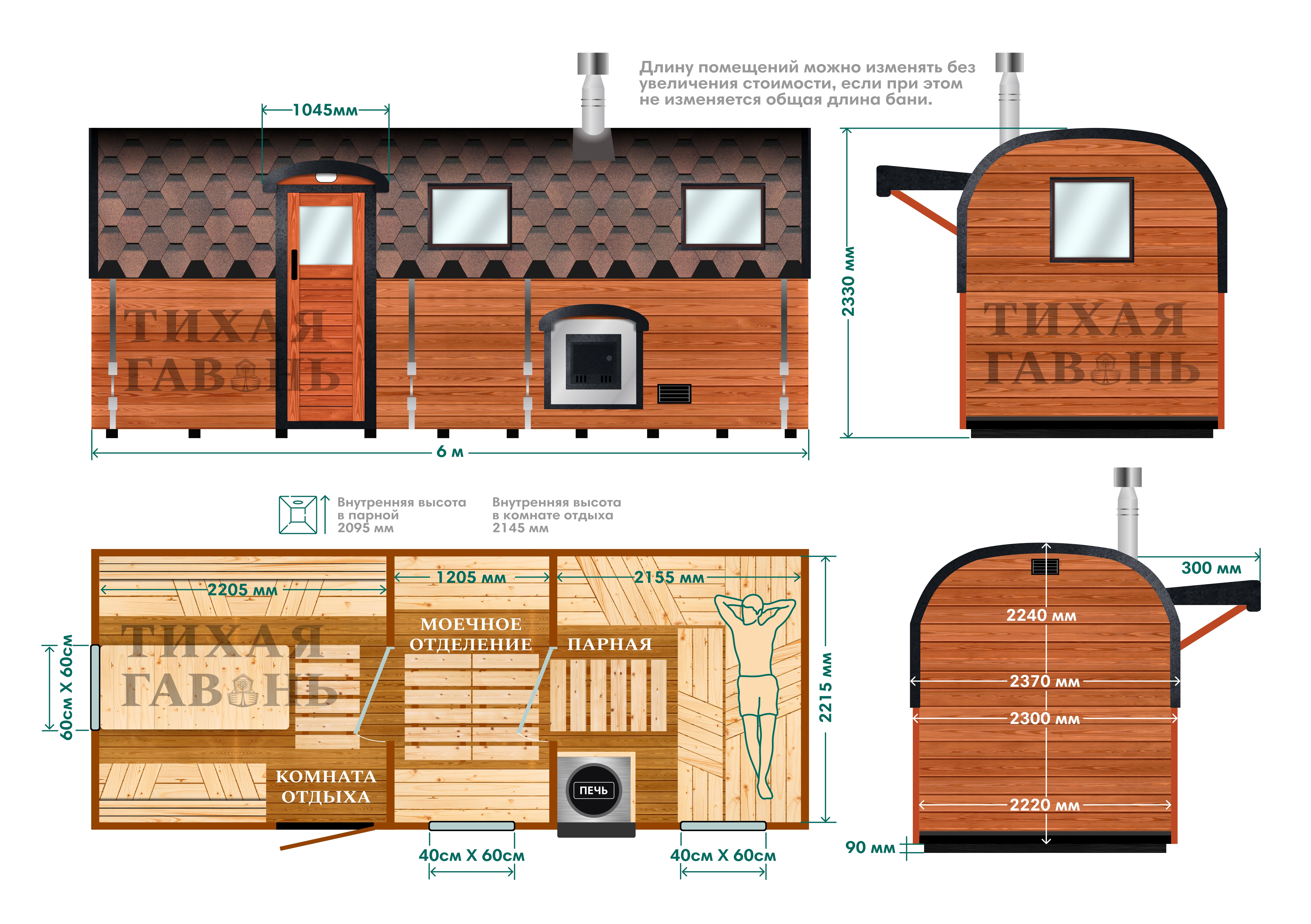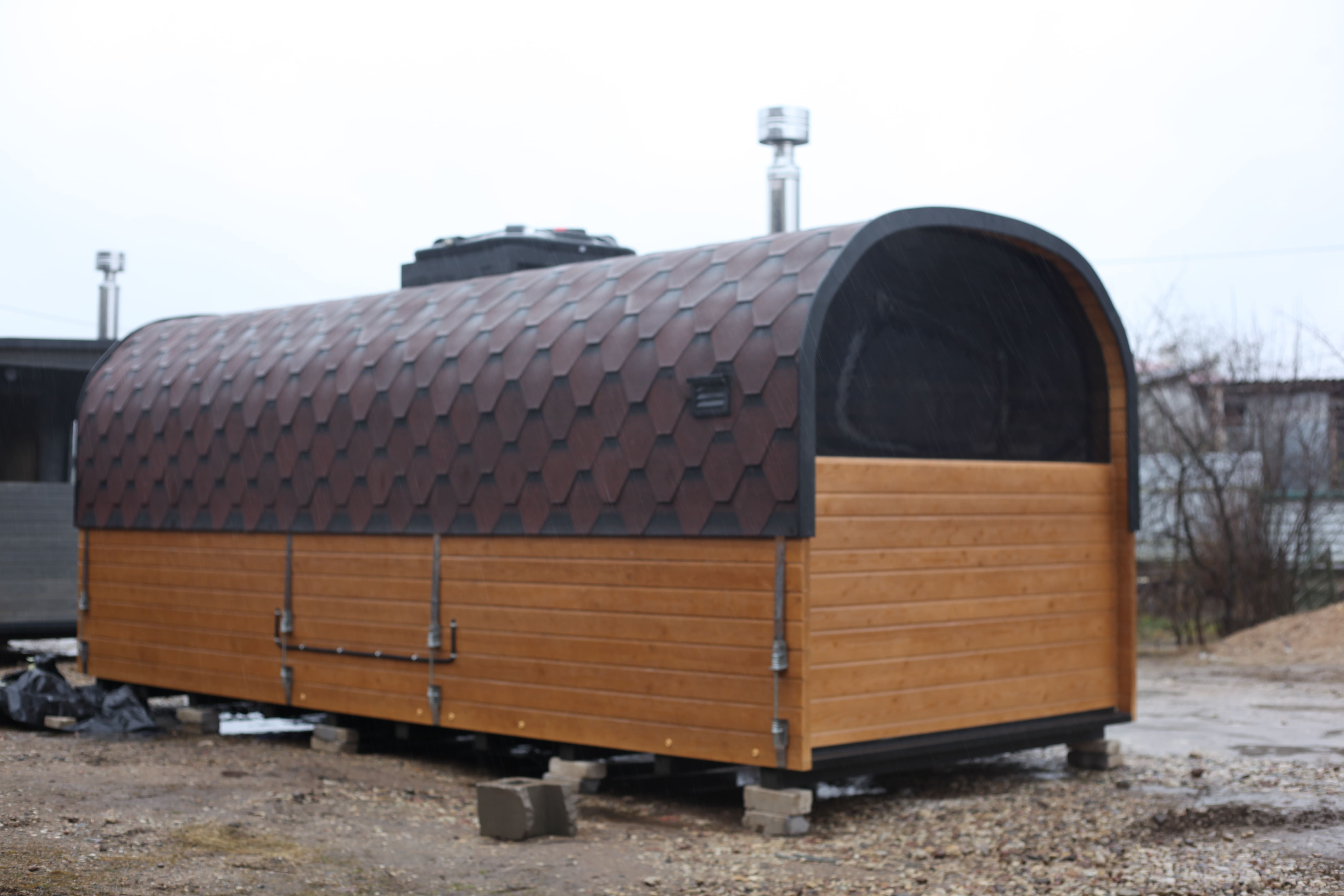 Стандартные габариты модели составляют 2,37 м по ширине и 2,24 м по высоте. По запросу возможно изготовление бани с увеличенной высотой, что удобно для высоких людей и тех, кто ценит простор.