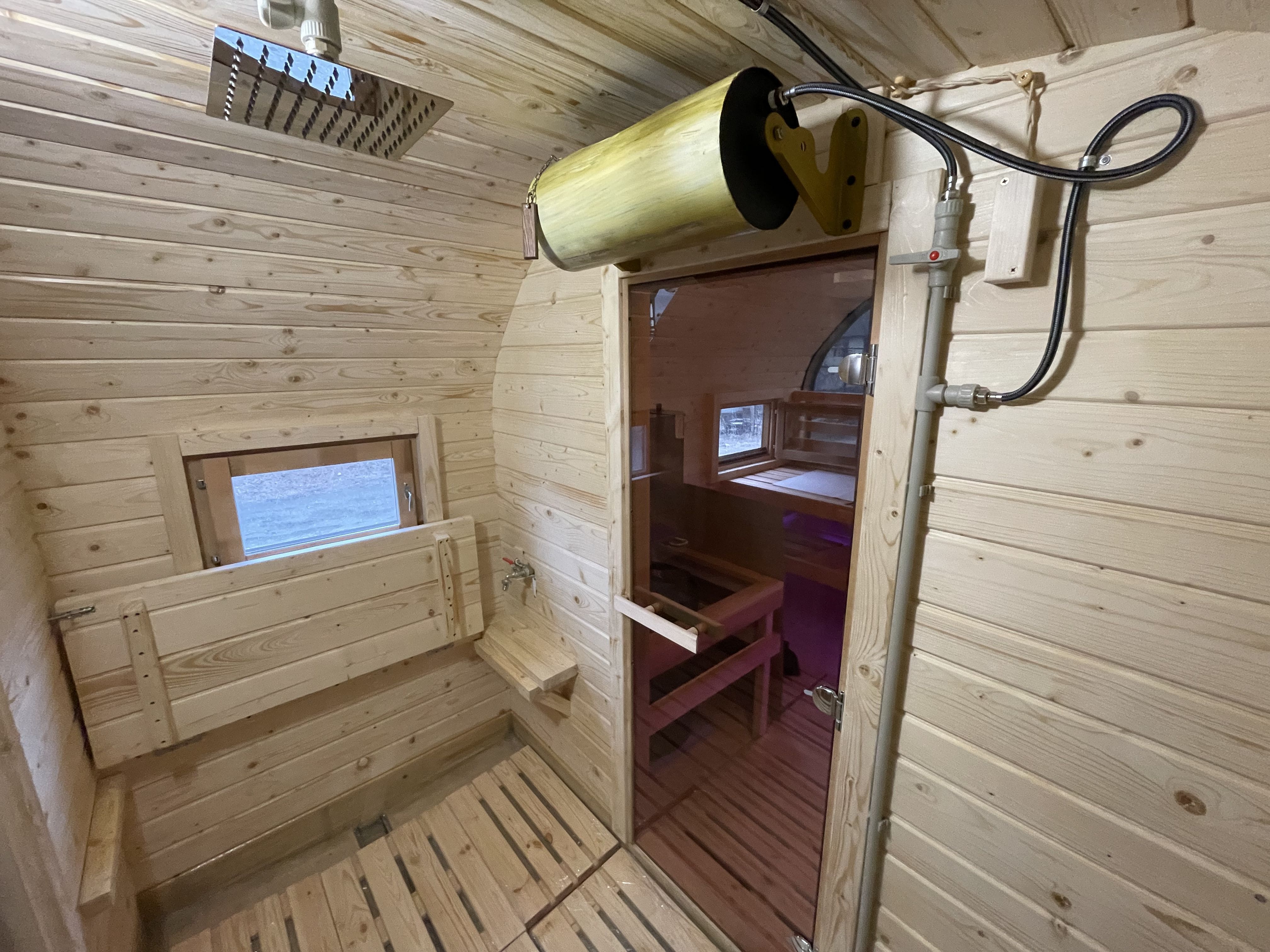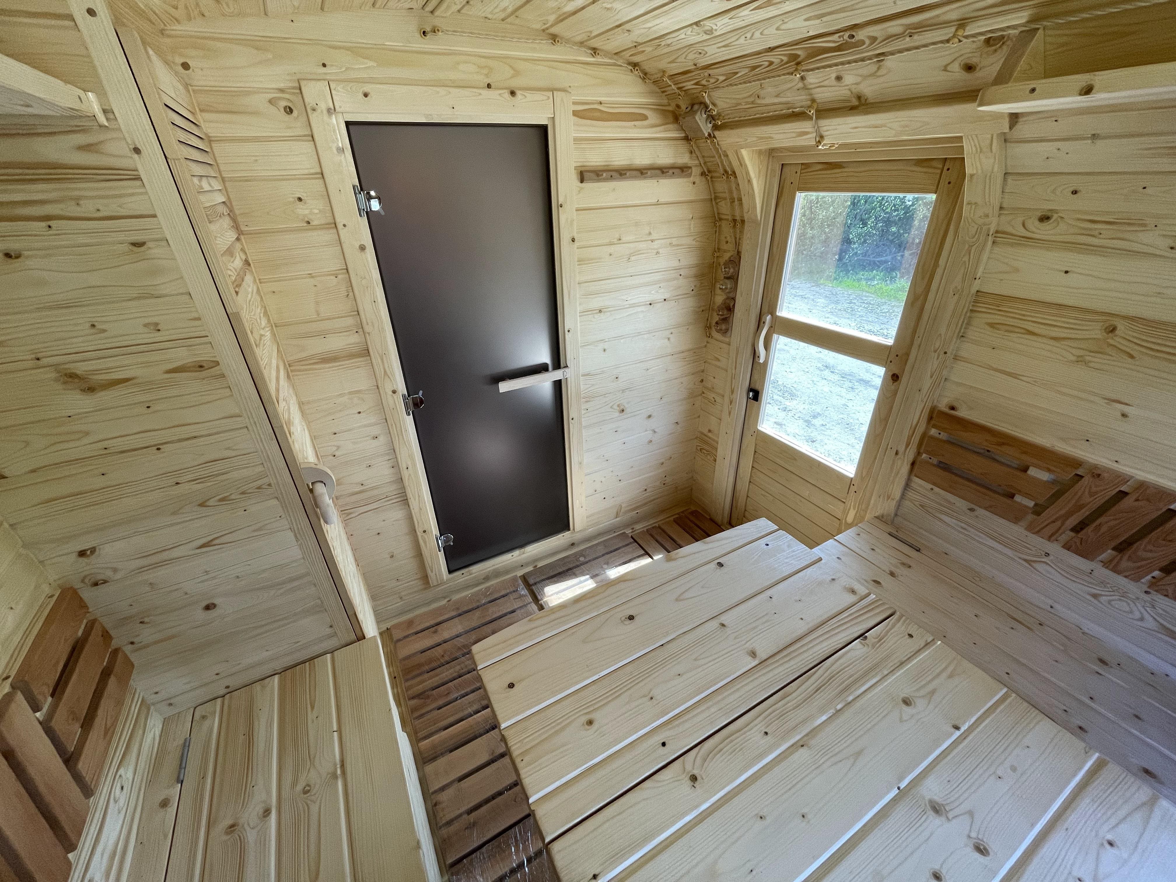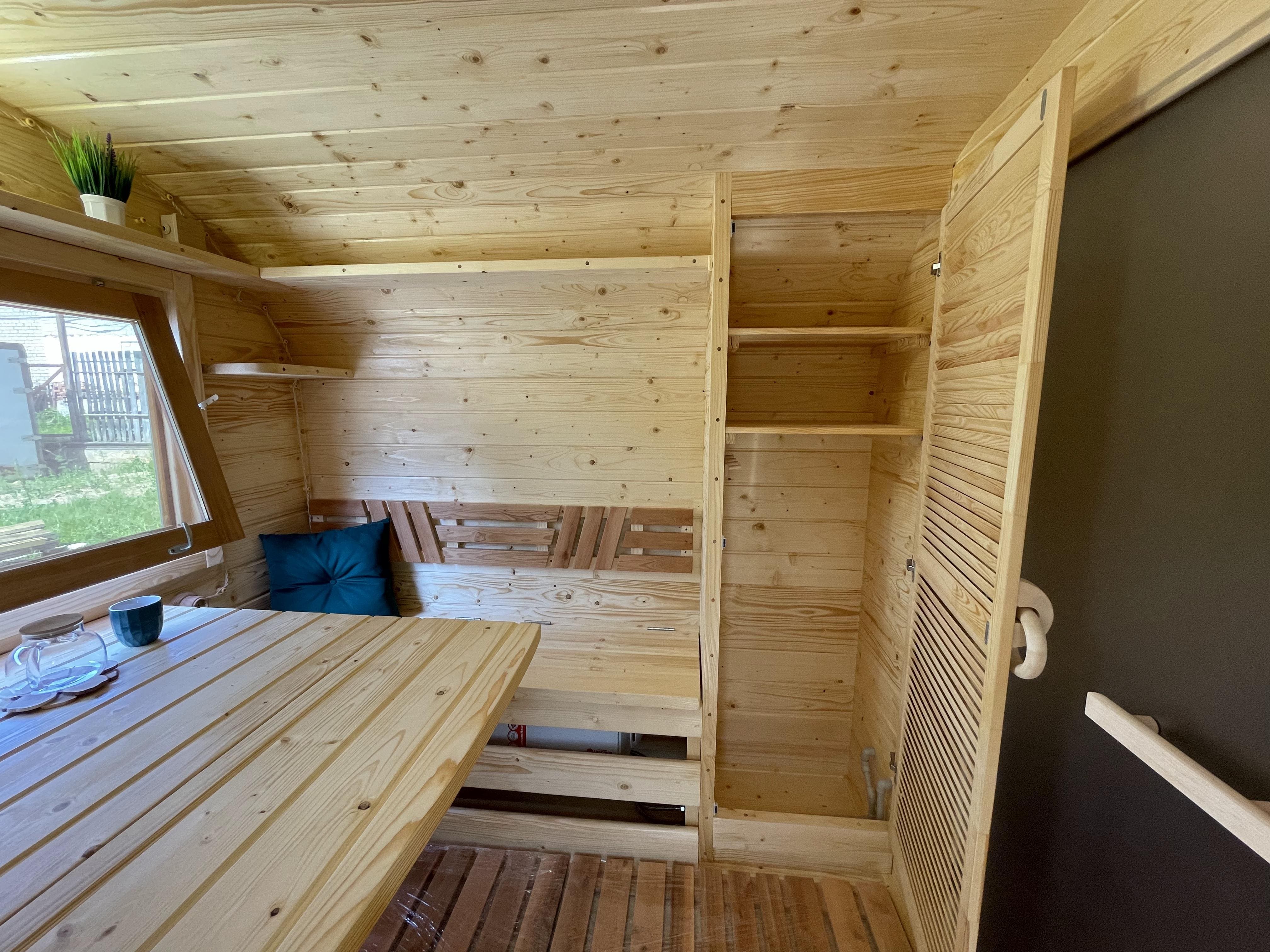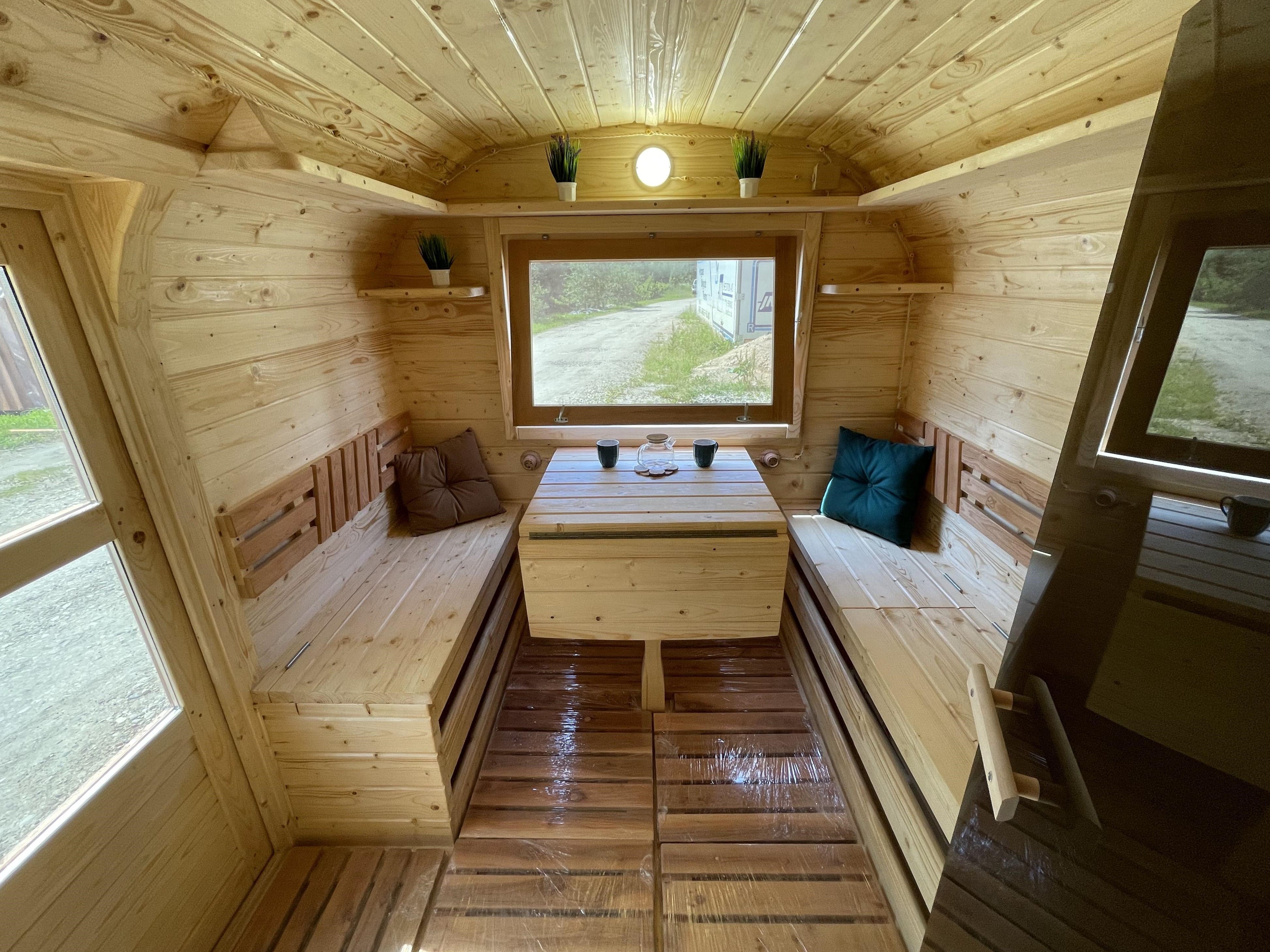 Стандартные габариты модели составляют 2,37 м по ширине и 2,24 м по высоте. По запросу возможно изготовление бани с увеличенной высотой, что удобно для высоких людей и тех, кто ценит простор.