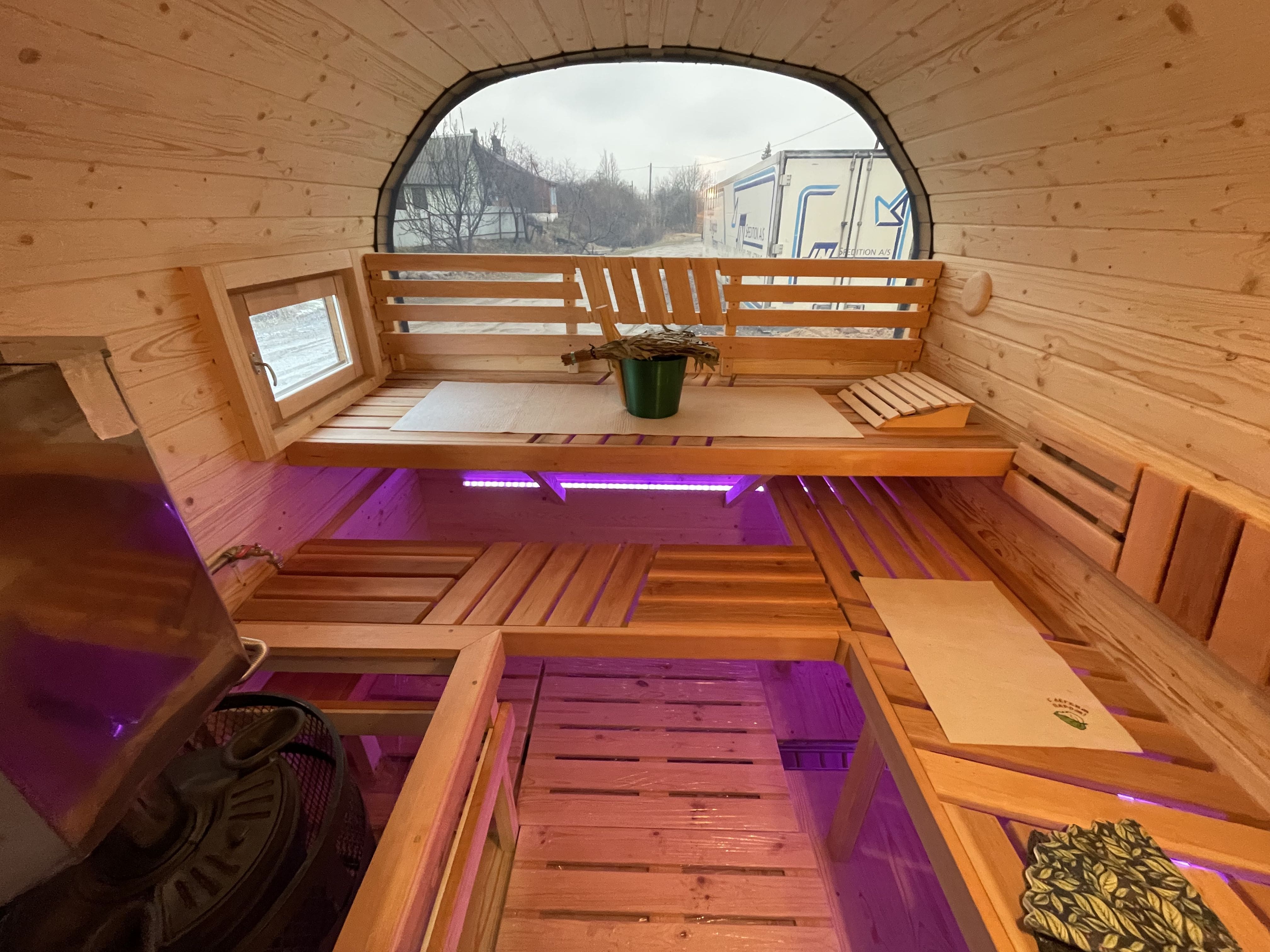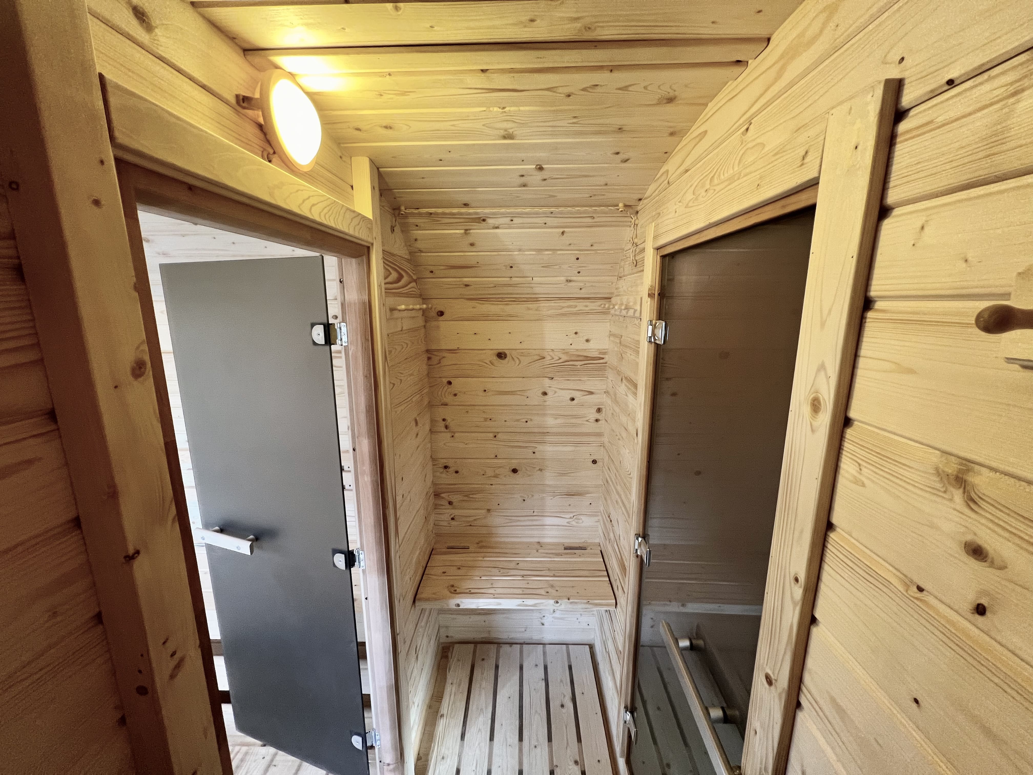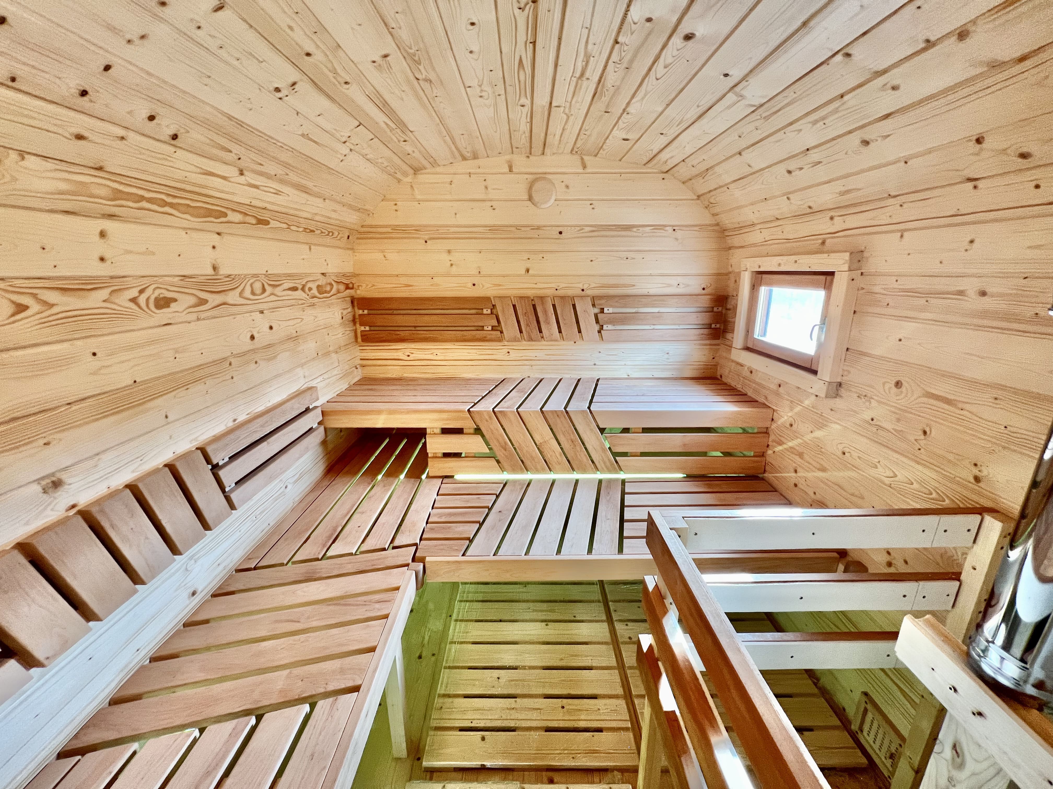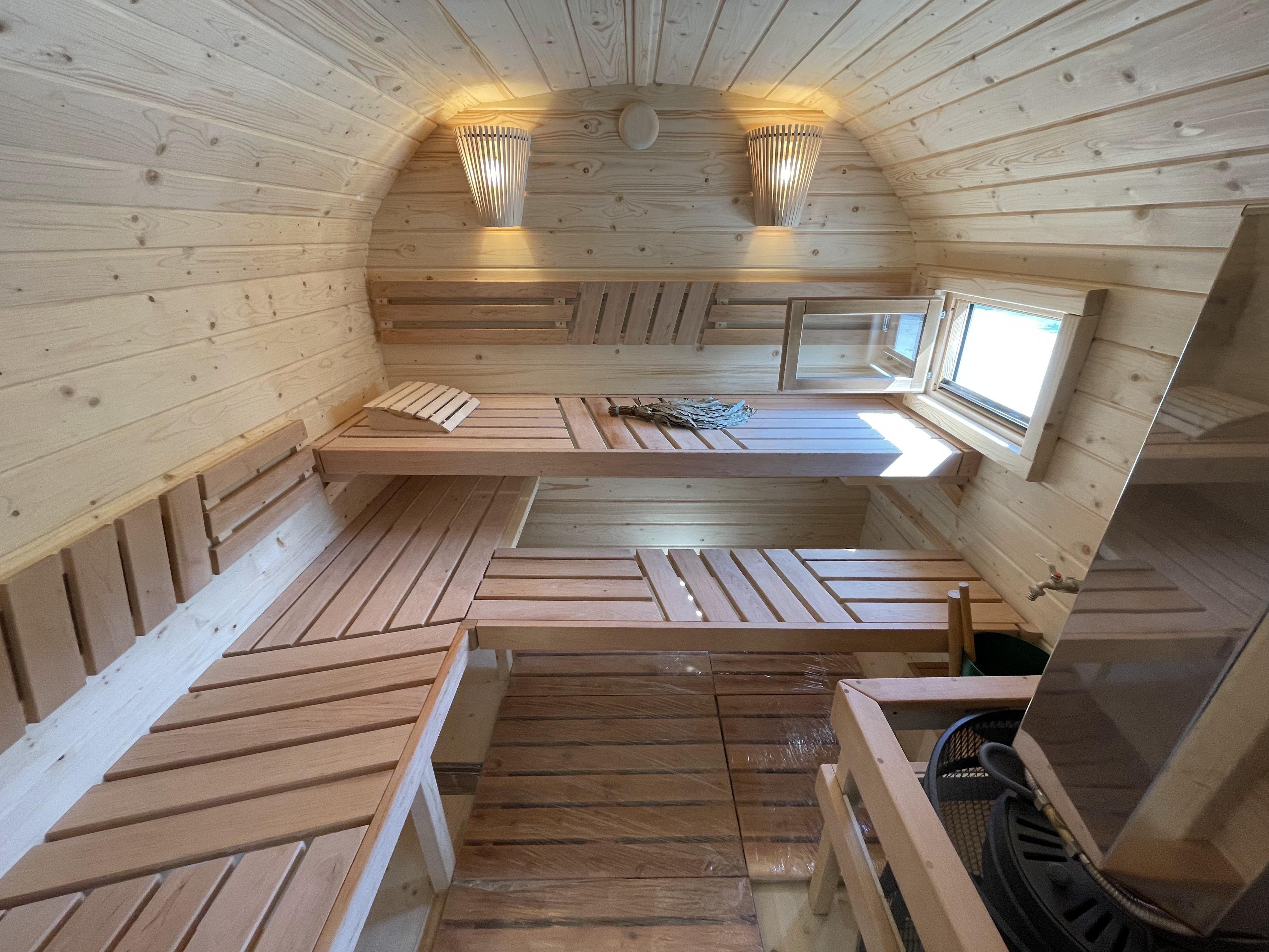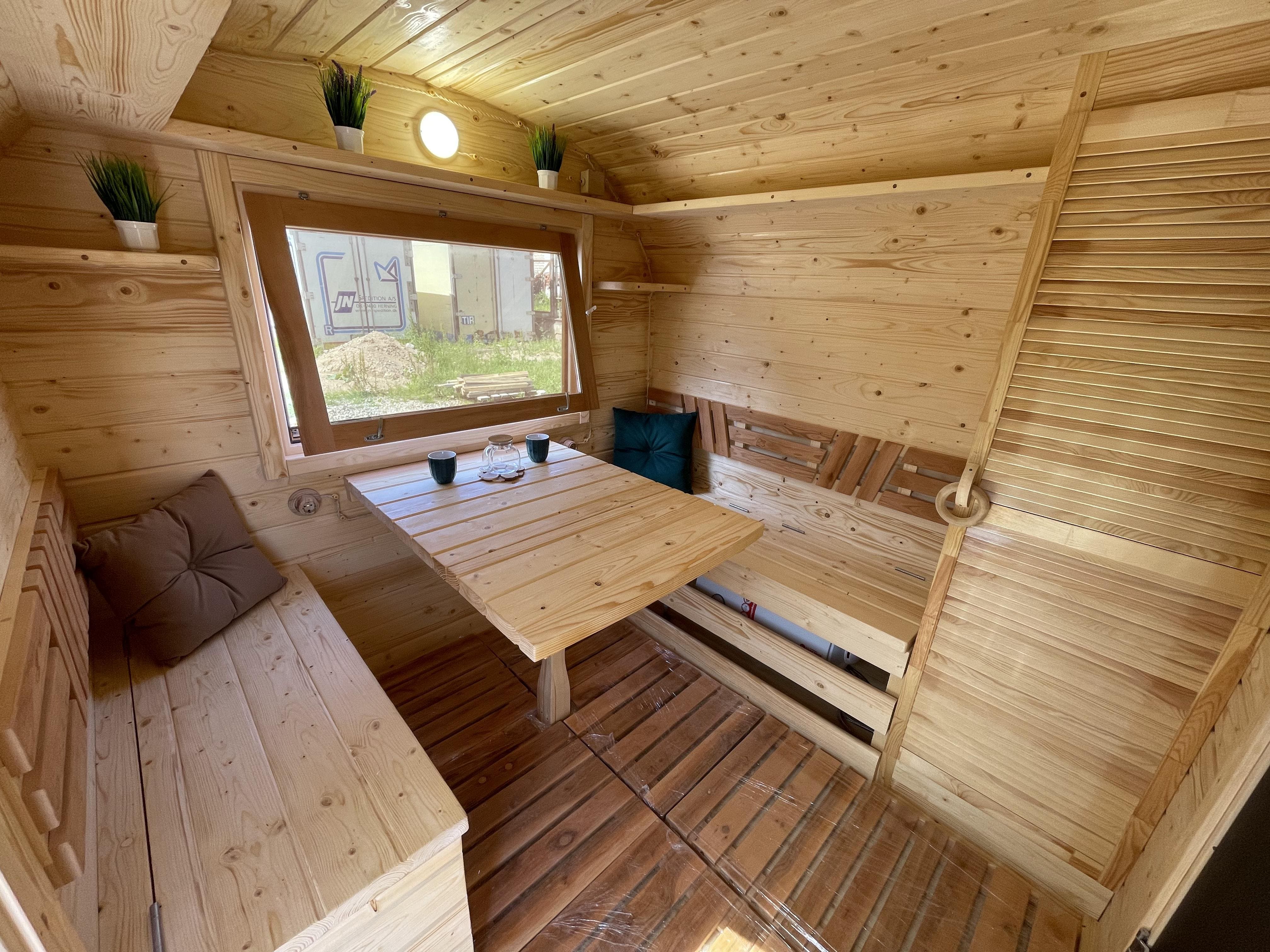 Стандартные габариты модели составляют 2,37 м по ширине и 2,24 м по высоте. По запросу возможно изготовление бани с увеличенной высотой, что удобно для высоких людей и тех, кто ценит простор.