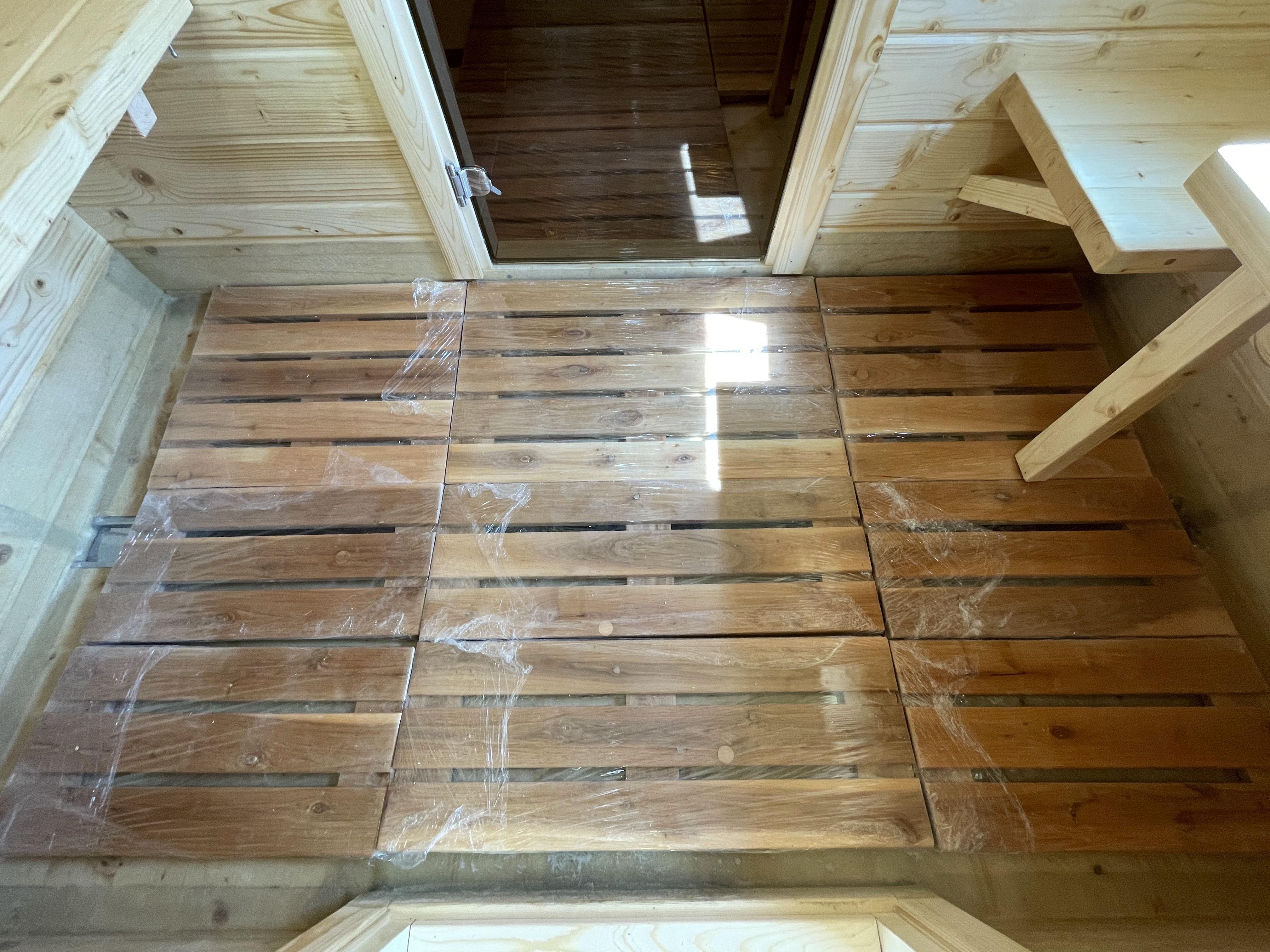 Пол обрабатывается яхтным лаком в два слоя. В парной применяется специальная пропитка для бань и саун, акже в два слоя. Двойной пол доступен как дополнительная опция, при его установке нижний уровень обрабатывается трудновымываемым антисептиком «Сенеж».