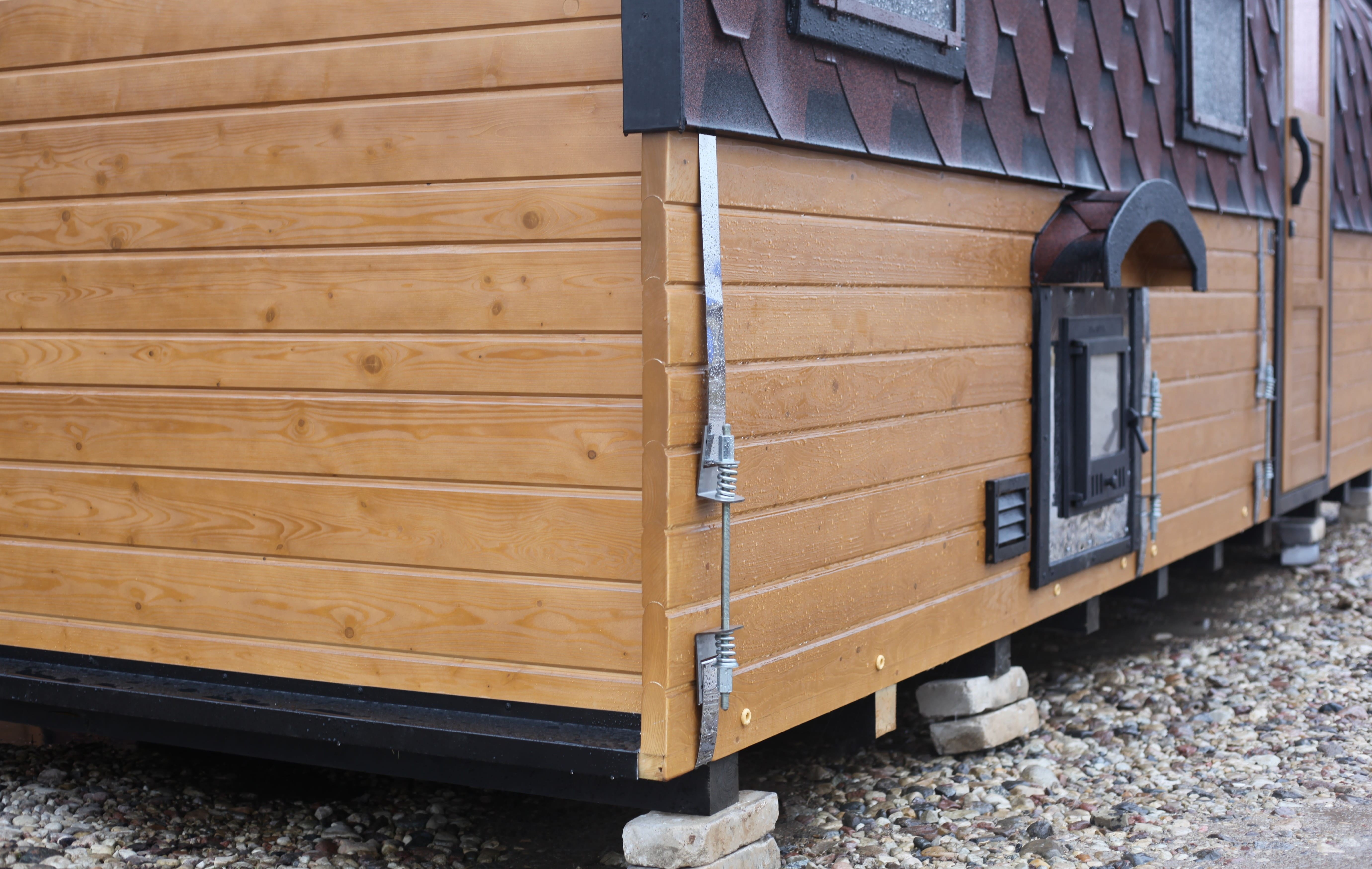 Корпус и основание бани выполняются из древесины камерной сушки и собираются с применением металлических элементов крепления. В конструкции корпуса и перегородок используются следующие решения: